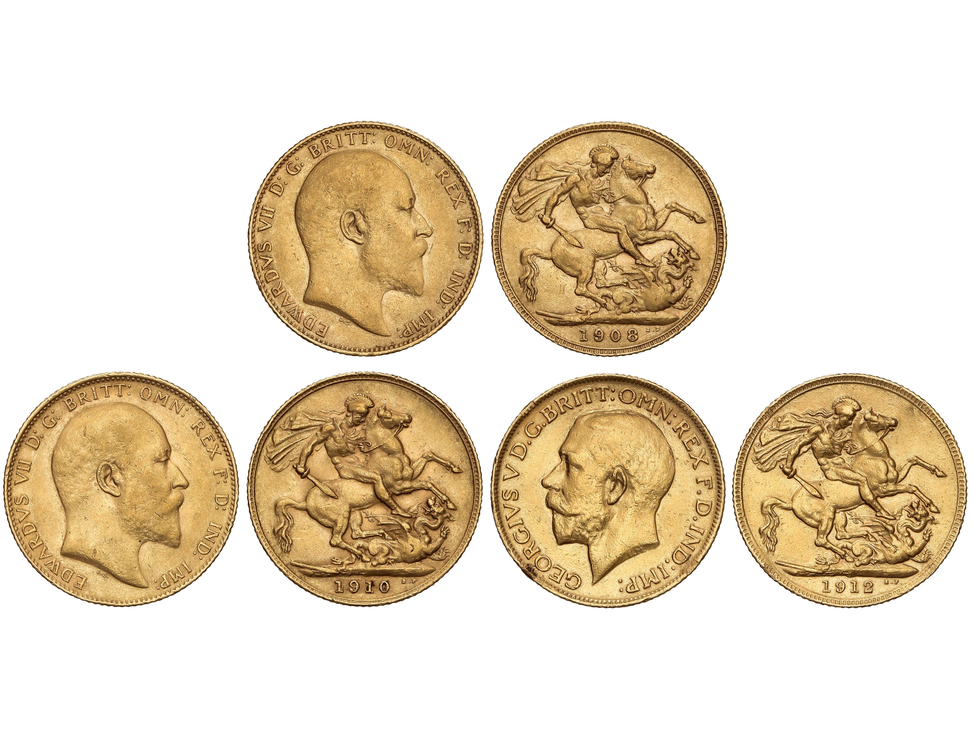 1032 imageLote 3 monedas Sovereign. 1908, 1910 y 1912. GEORGE V y EDWARD VII. Peso total de 23,87 grs. AU (917). (Una descolgada). Fr-400, 404; KM-805, 820. MBC. (Image1)