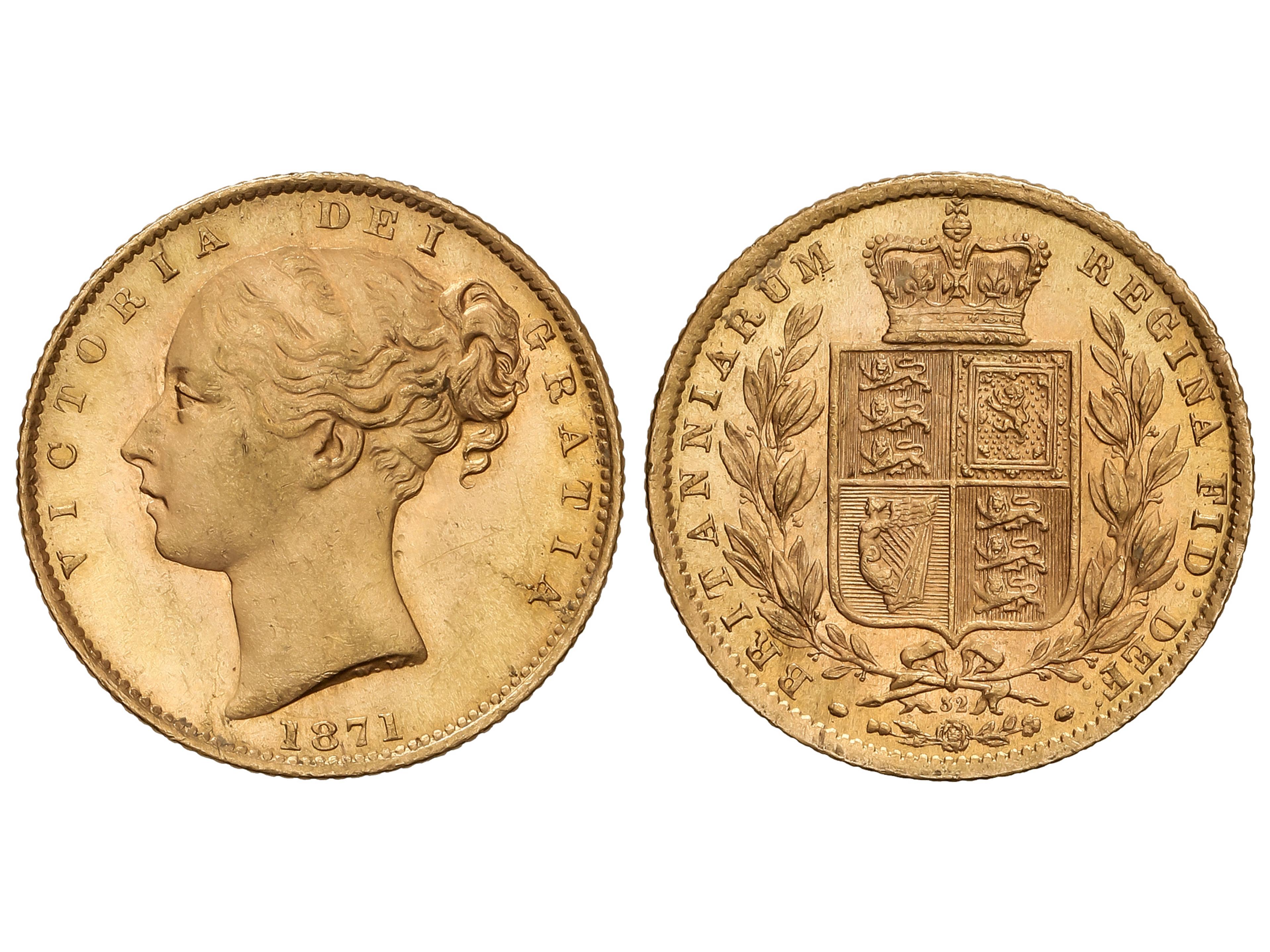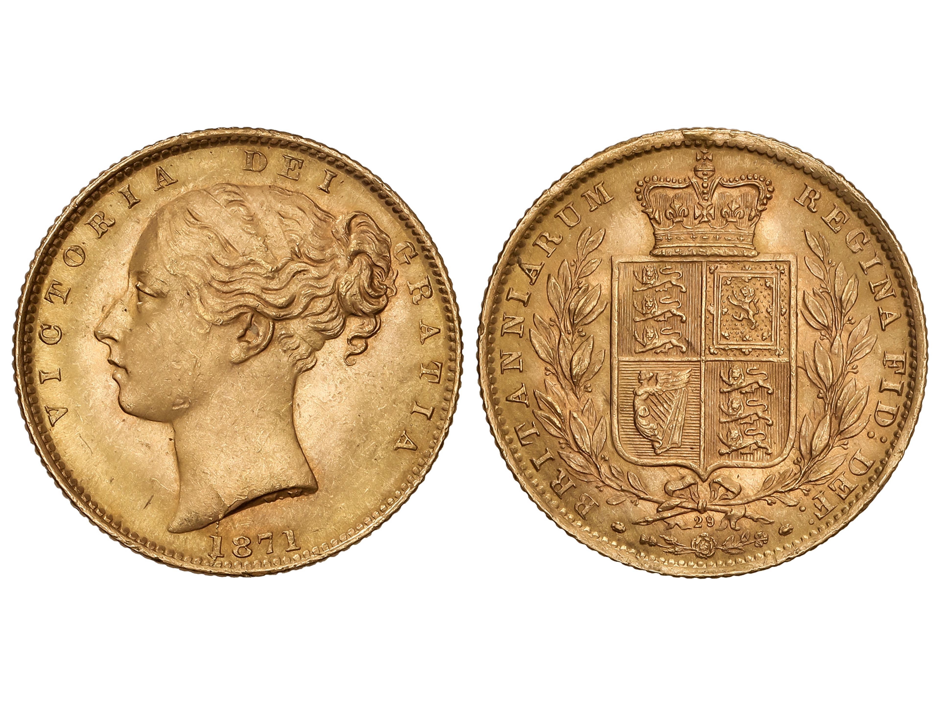 1030 imageSovereign. 1871. VICTORIA. 7,98 grs. AU (917). 29 bajo escudo del reverso. Brillo original. Fr-387i; KM-736.2. MBC+. (Image1)