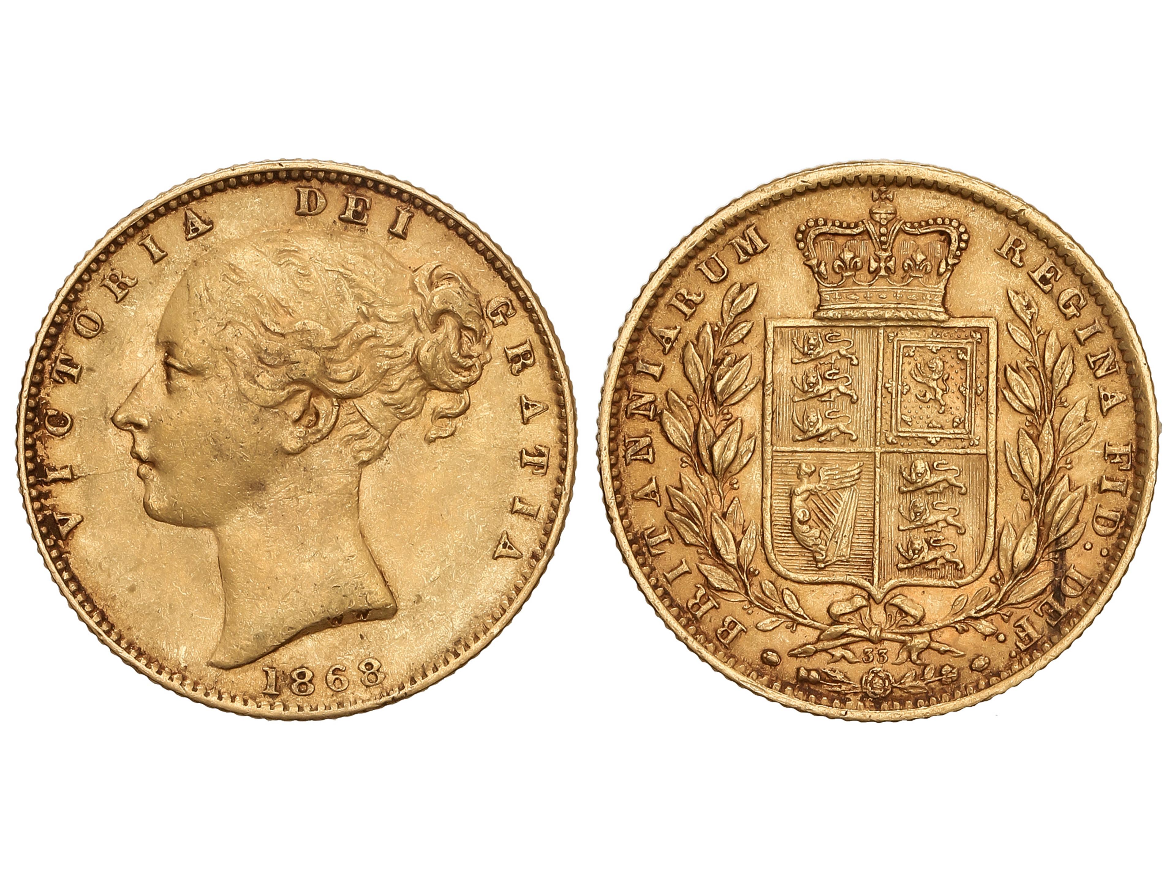1028 imageSovereign. 1868. VICTORIA. 7,95 grs. AU (917). 33 bajo escudo del reverso. Fr-387i; KM-736.2. MBC+. (Image1)