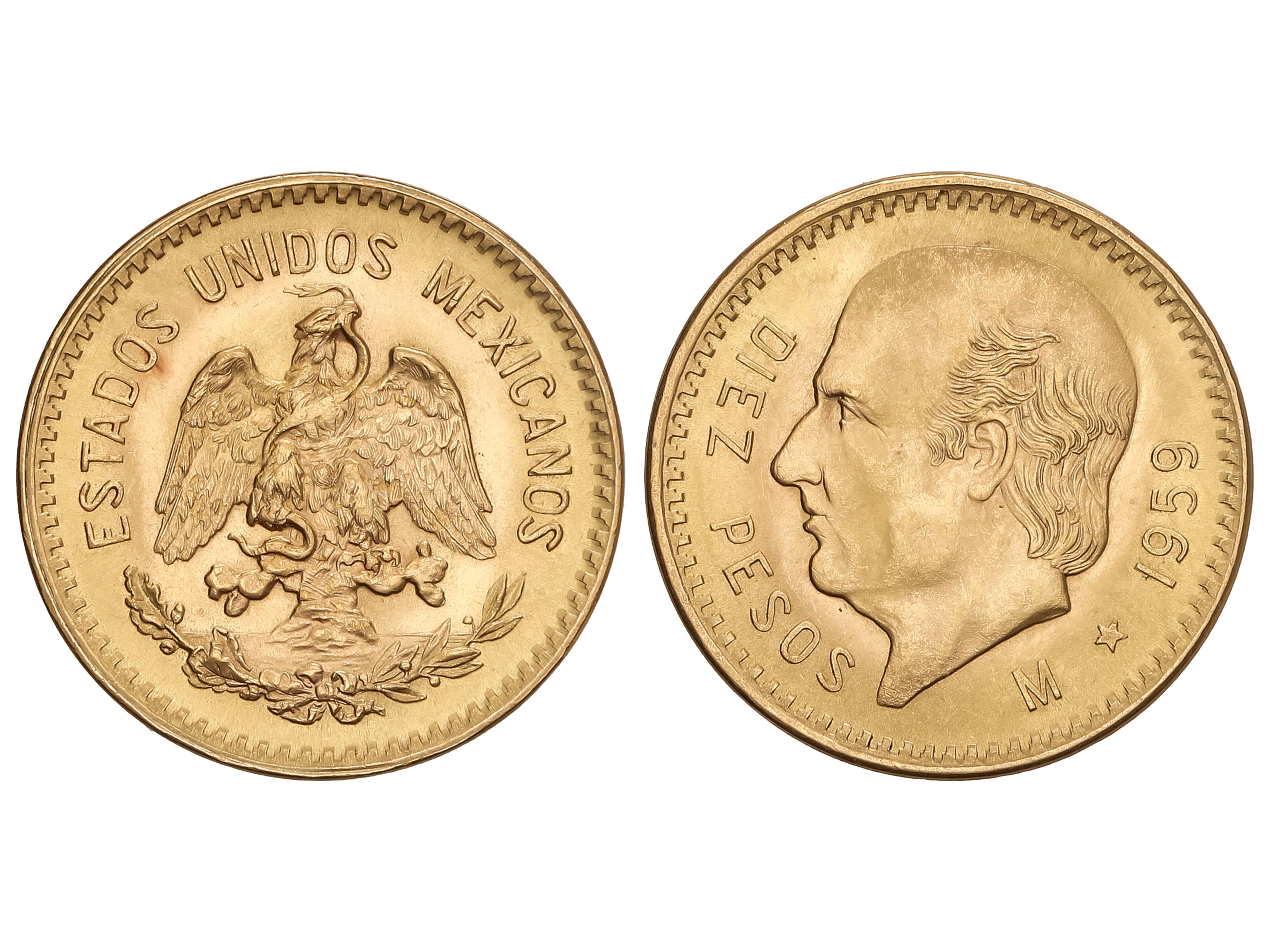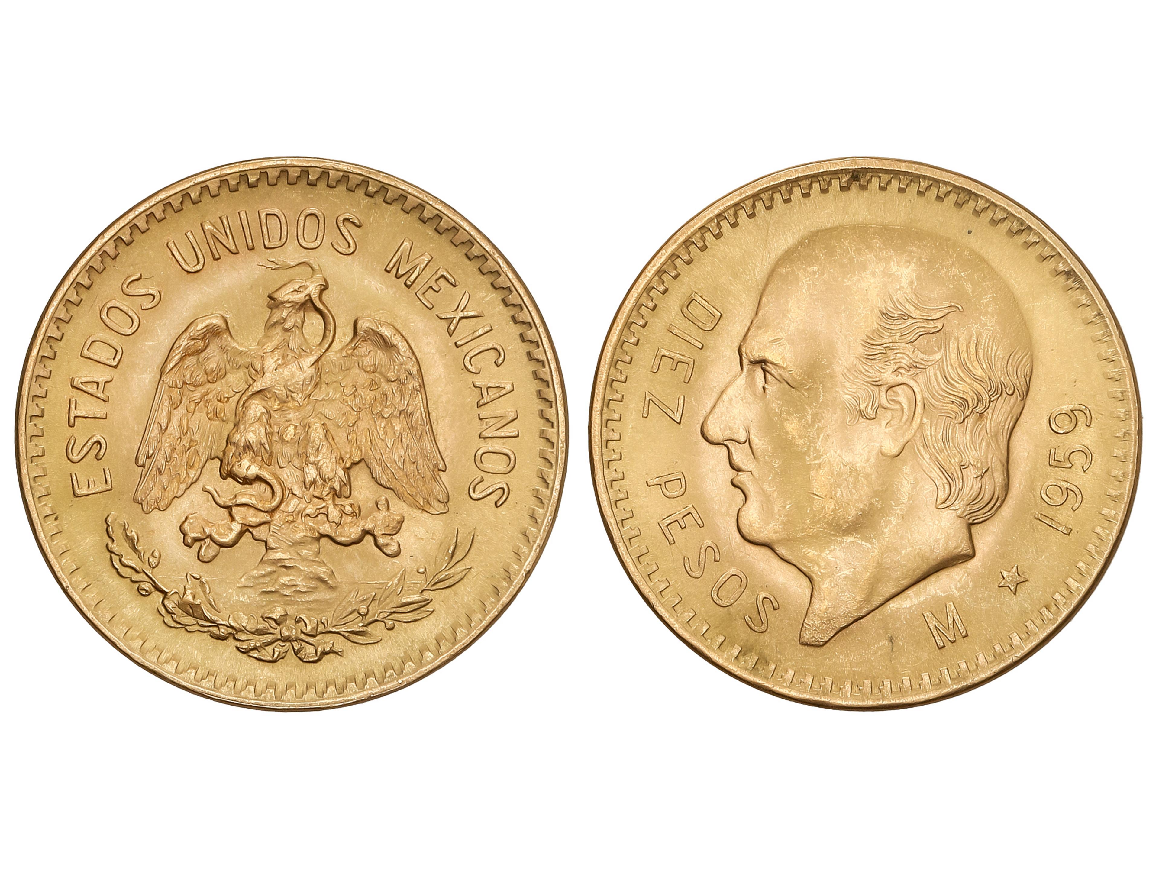 1037 image10 Pesos. 1959. 8,31 grs. AU (900). Hidalgo. Reacuñación oficial (Restrike). Fr-166R; KM-473. SC-. (Image1)