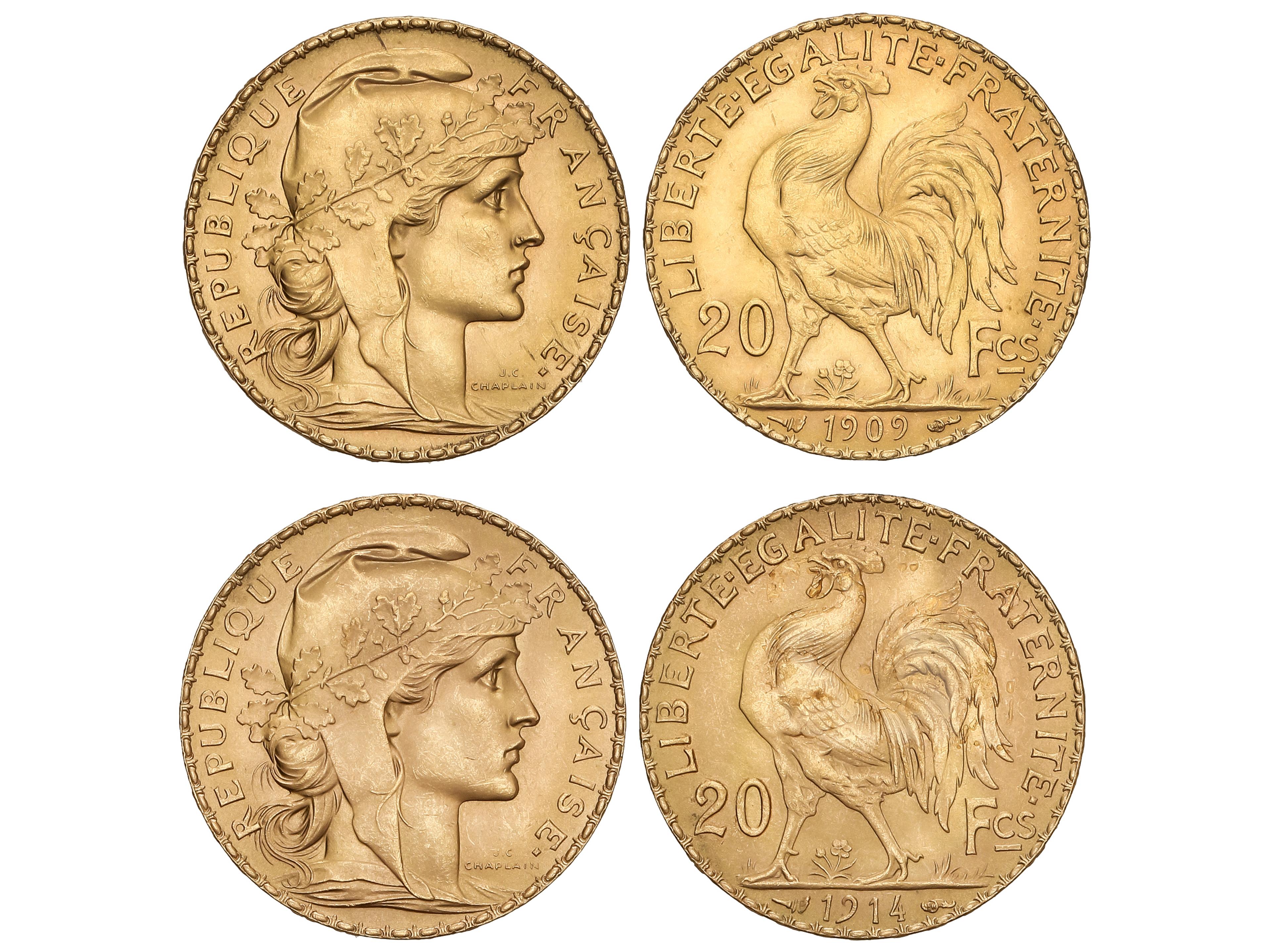 1026 imageLote 2 monedas 20 Francs. 1909 y 1914. III REPUBLIQUE. Peso total de 12,90 grs. AU (900). Gallo. Fr-596a; KM-857. EBC+. (Image1)