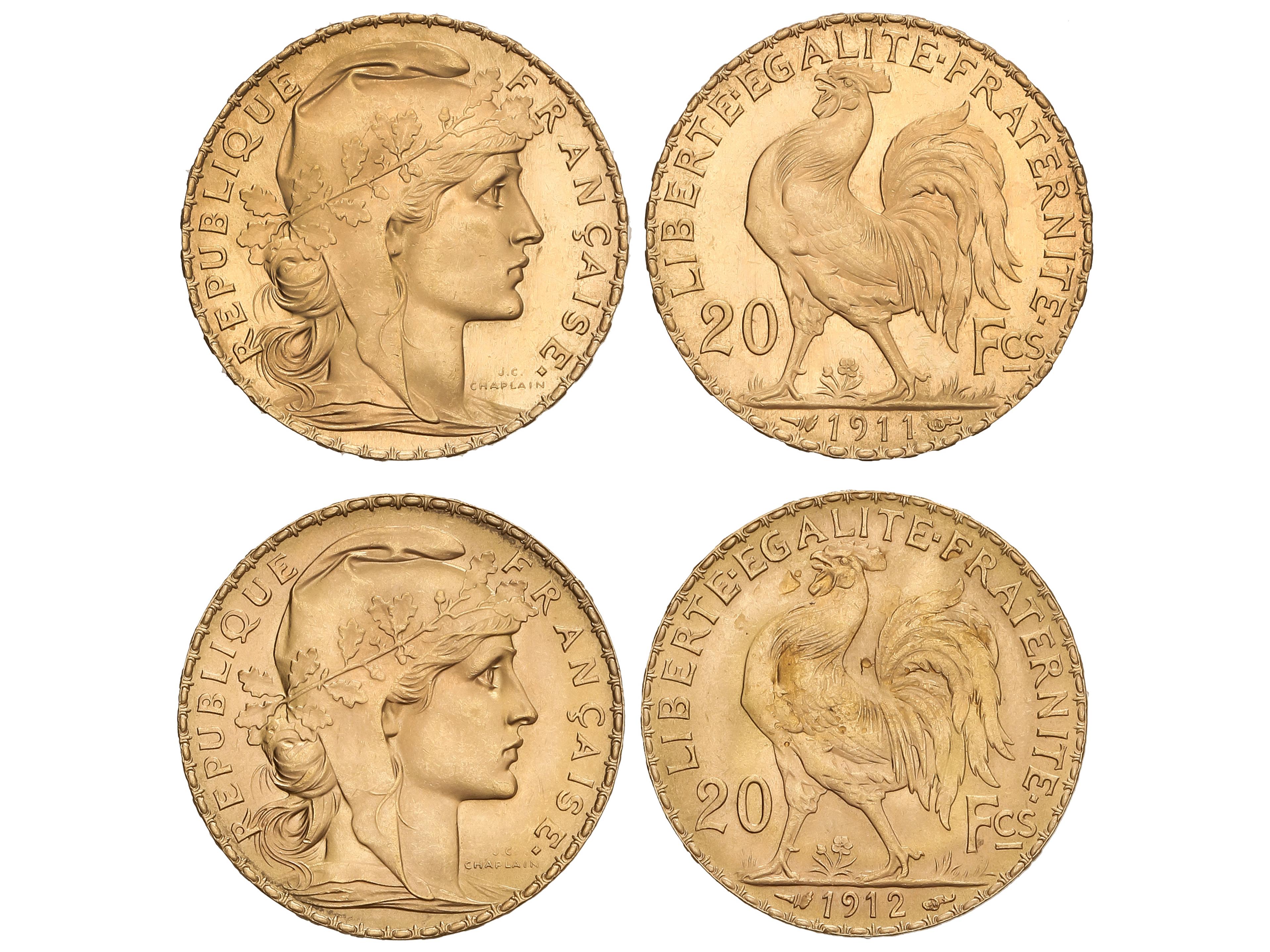 1025 imageLote 2 monedas 20 Francs. 1911 y 1912. III REPUBLIQUE. Peso total de 12,88 grs. AU (900). Gallo. Fr-596a; KM-857. EBC+. (Image1)