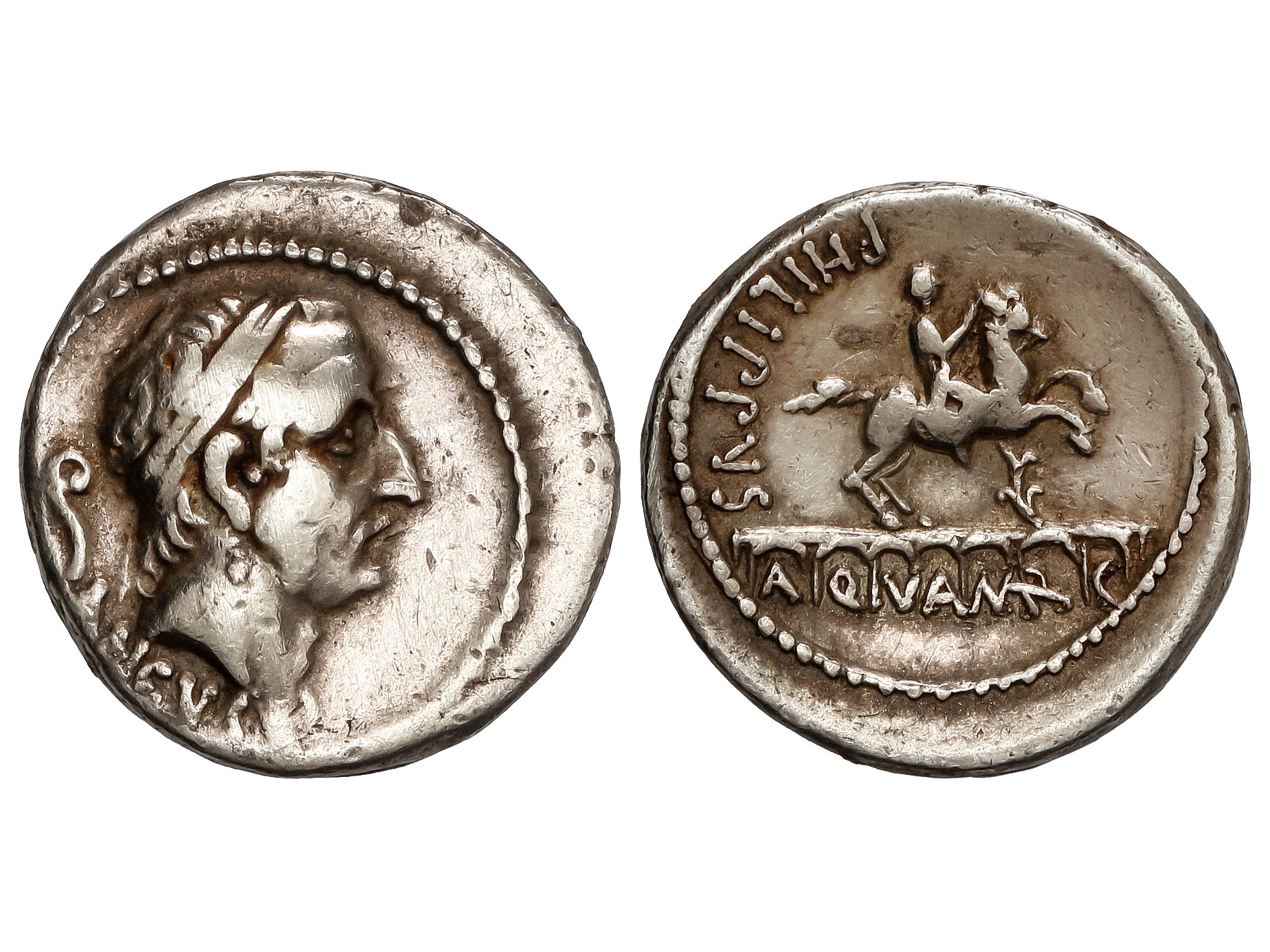 Denario. 56 a.C. MARCIA. C. Marcius Philippus. Anv.: Cabeza diademada de Ancus Marcius a derecha, detrás lituo; debajo: ANCVS. Rev.: Estatua ecuestre a derecha, sobre acueducto de siete arcos, detrás PHILIPPVS