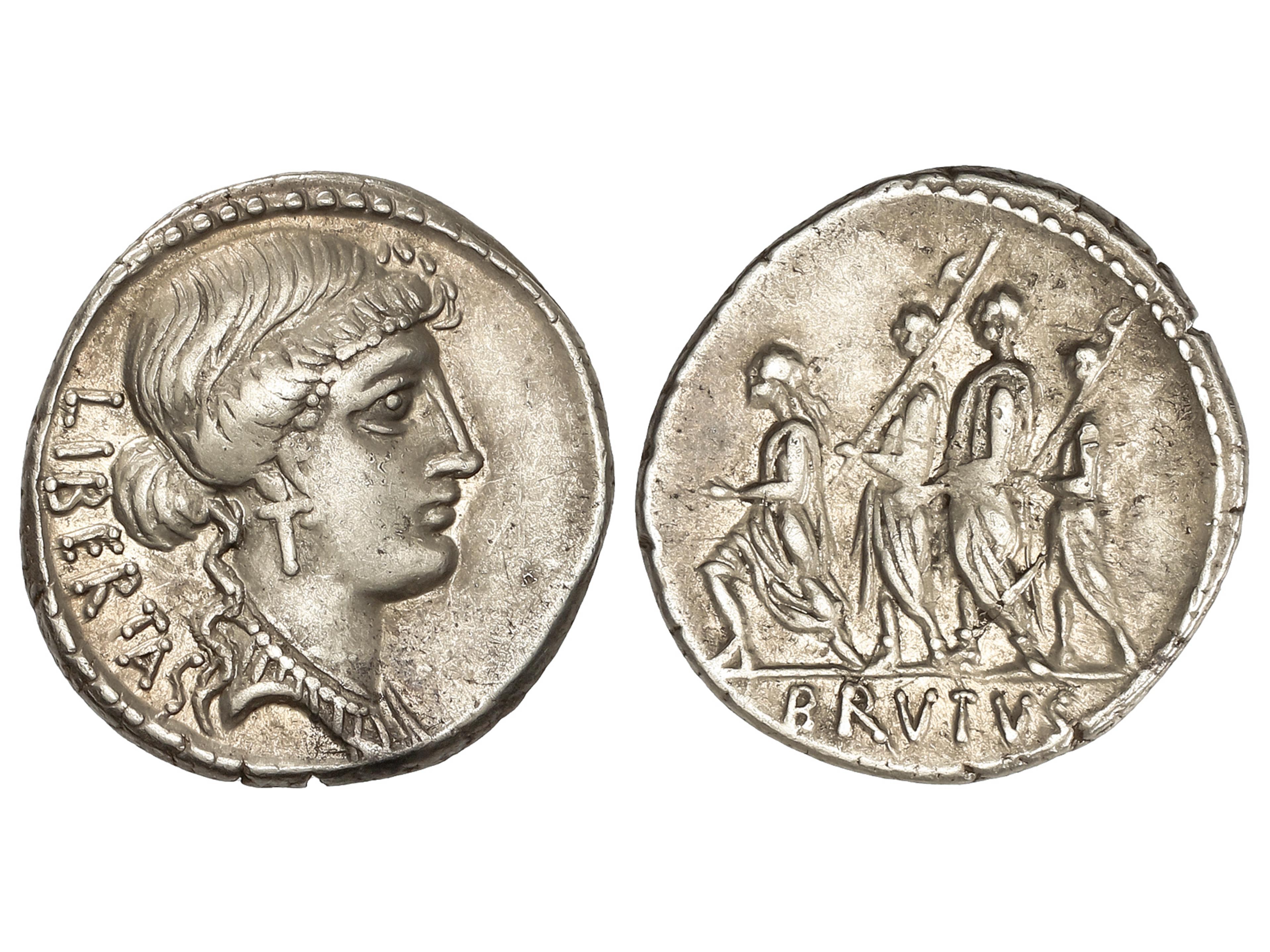 Denario. 54 a.C. JUNIA. Q. Caepio Brutus. Anv.: Cabeza de Libertad a derecha, detrás LIBERTAS. Rev.: Accensus, dos lictores y Bruto marchando a izquierda. En exergo: BRVTVS. 3,91 grs. AR. (Leves rayitas).