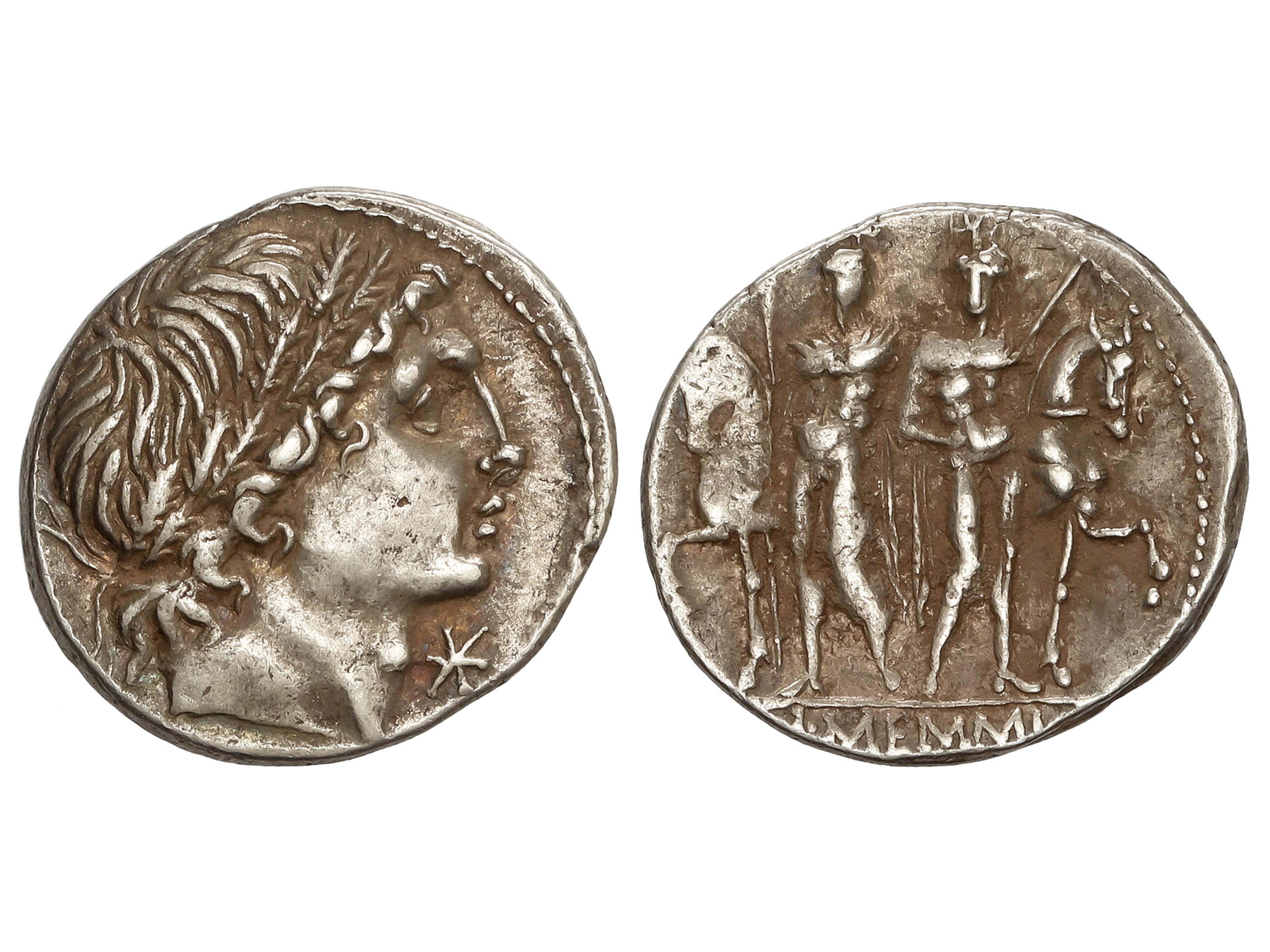 Denario. 109-108 a.C. MEMMIA. L. Memmius. Anv.: Cabeza masculina a derecha, delante estrella. Rev.: Dióscuros de pie sosteniendo las bridas de sus caballos. En exergo: L.MEMMI. 3,95 grs. AR. BMC-643; Cal-980;
