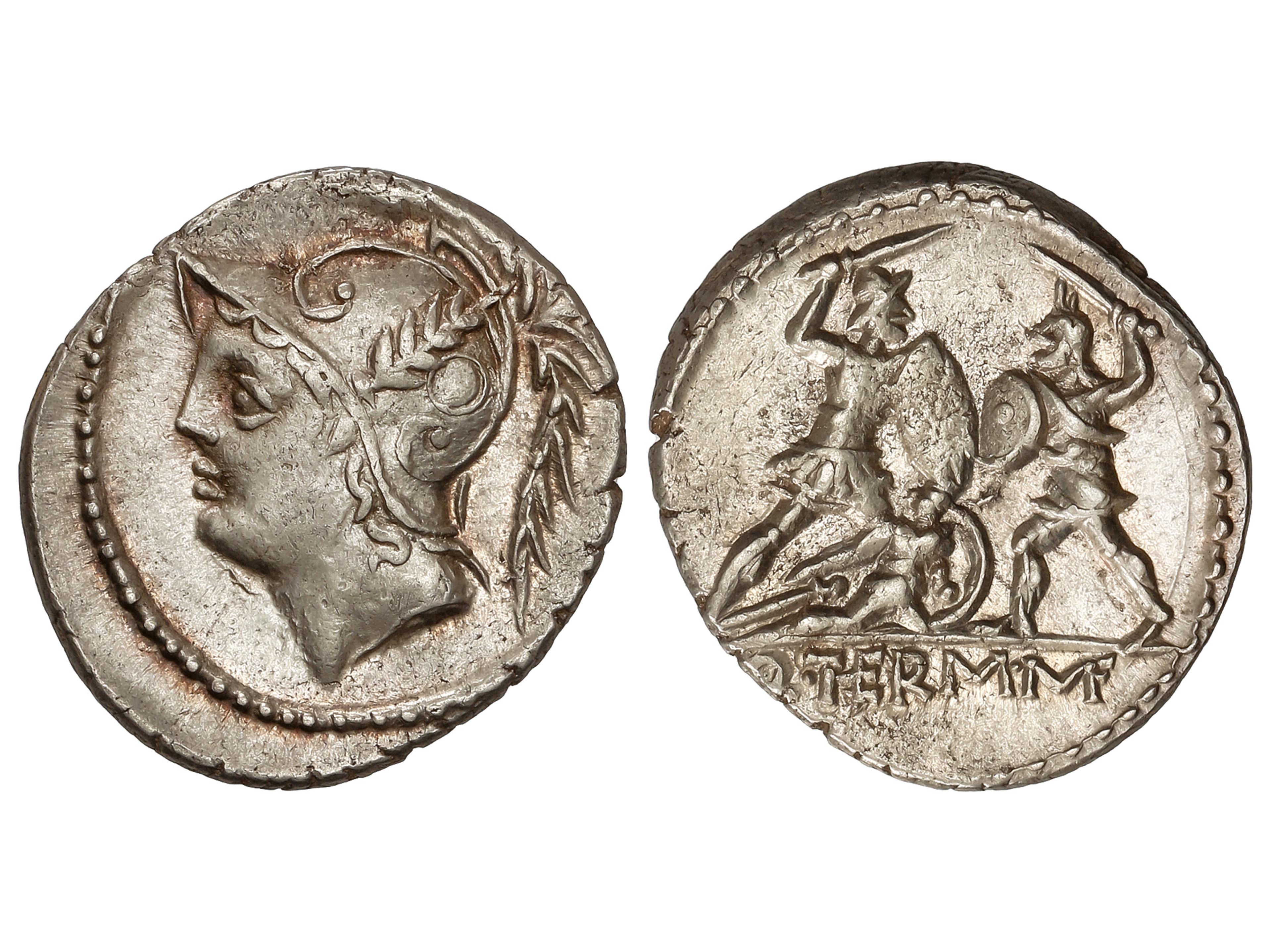 Denario. 103 a.C. MINUCIA. Q. Minucius Thermus M.f. Anv.: Cabeza de Marte a izquierda. Rev.: Tres soldados combatiendo. En exergo Q. THERM. M.(F). (THE y MF nexadas). 3,96 grs. AR. BMC-653; Cal-1029;