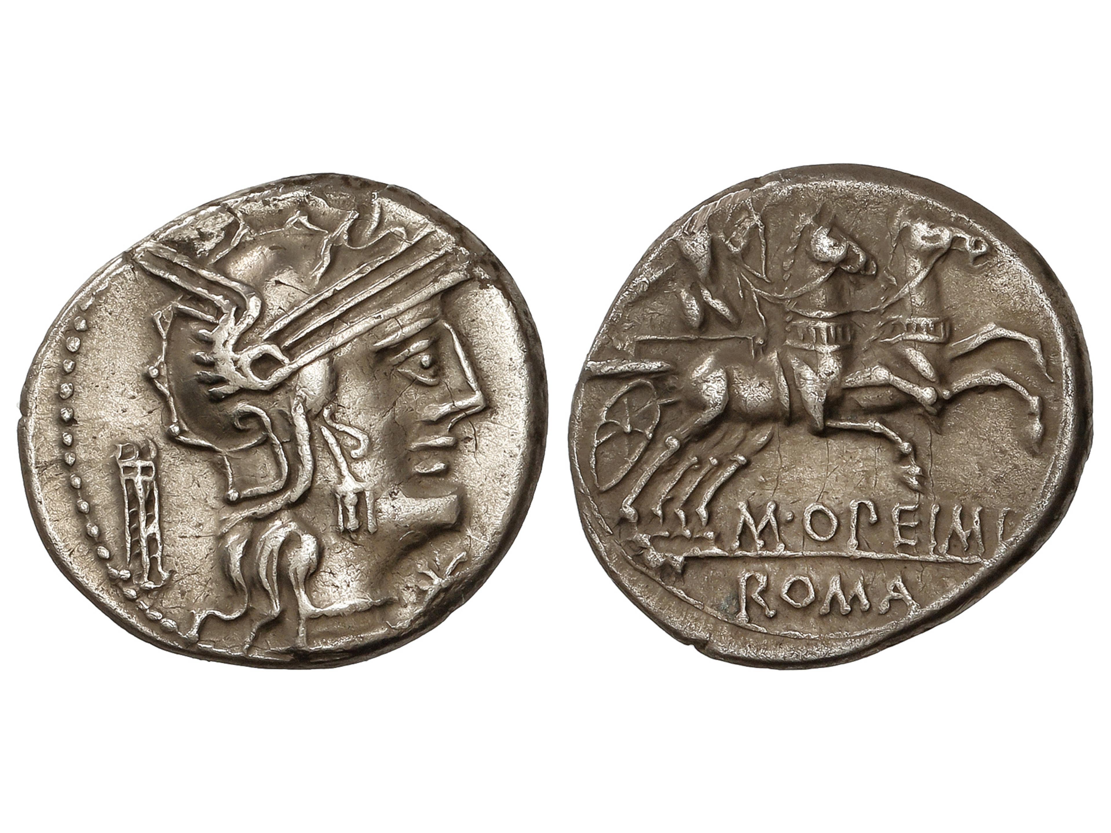 Denario. 131 a.C. OPIMIA. M. Opeimius. Anv.: Cabeza de Roma a derecha, entre trípode y estrella. Rev.: Apolo en biga a derecha, debajo M. OPEIMI. En exergo: ROMA. 3,86 grs. AR. BMC-1137; Cal-1056; Craw-254/1;