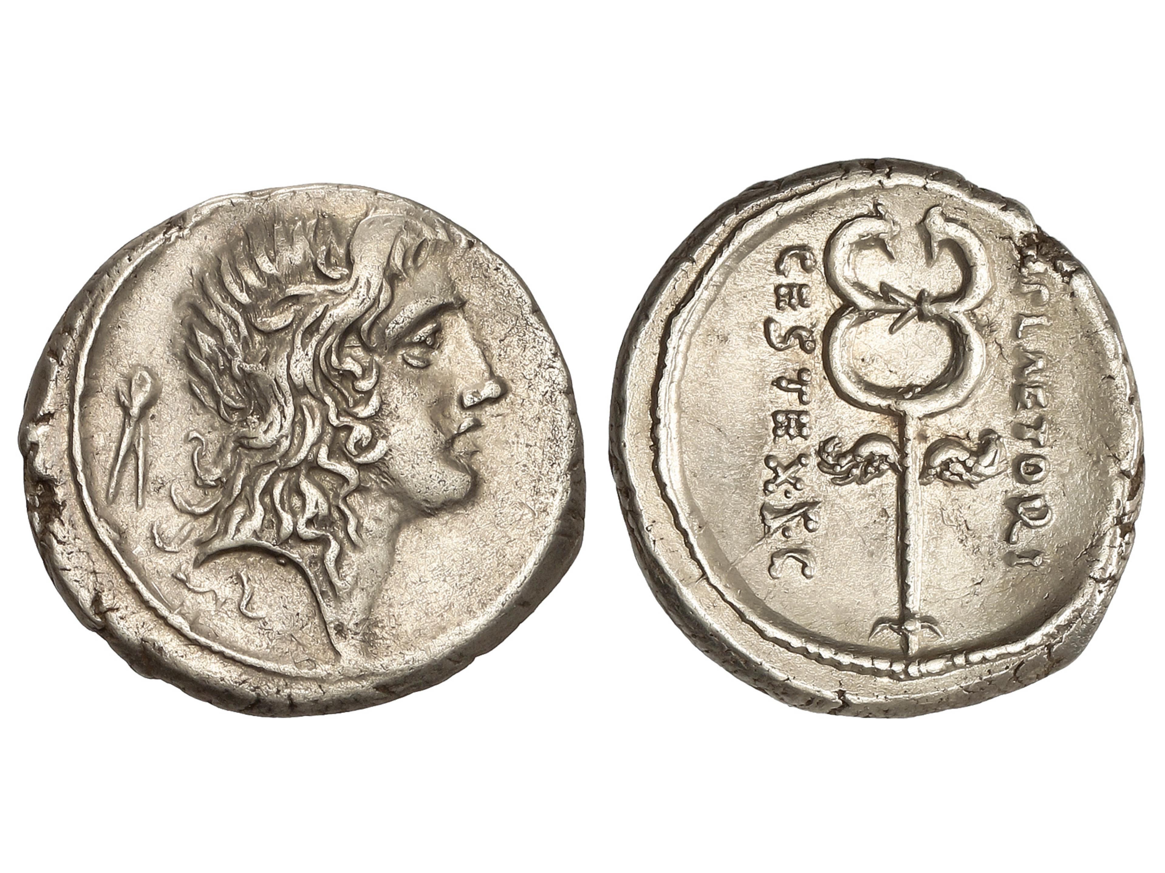 Denario. 69 a.C. PLAETORIA. M. Plaetorius M.f. Cestianus. Anv.: Cabeza de Bonus Eventus joven a derecha, detrás símbolo. Rev.: Caduceo alado entre M. PLAETORI y CEST. EX. S.C. 3,98 grs. AR. Restos de brillo