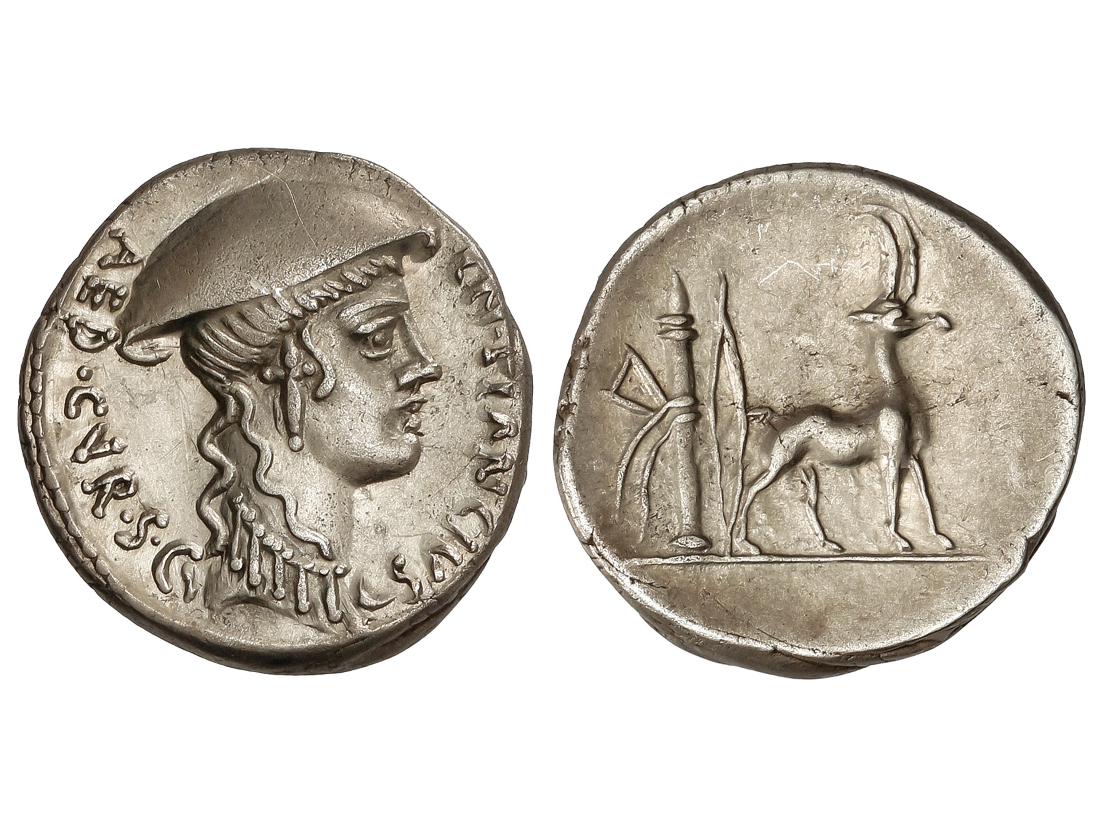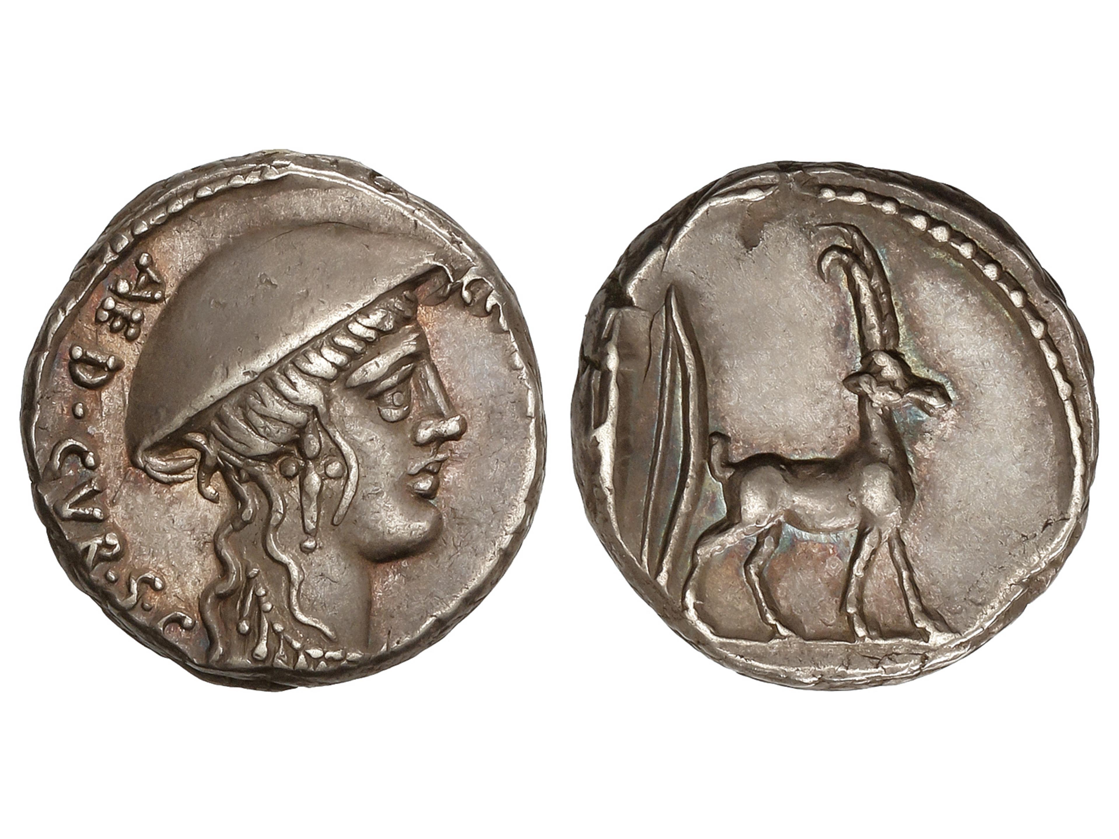 Denario. 55 a.C. PLANCIA. Cn. Plancius. Anv.: Cabeza de Diana Planciana a derecha C.N. PLANCIVS AED CVR. S.C. Rev.: Cabra a derecha, detrás carcaj y arco. 3,57 grs. AR. BMC-3920; Cal-1122; Craw-432/1; FFC-991;