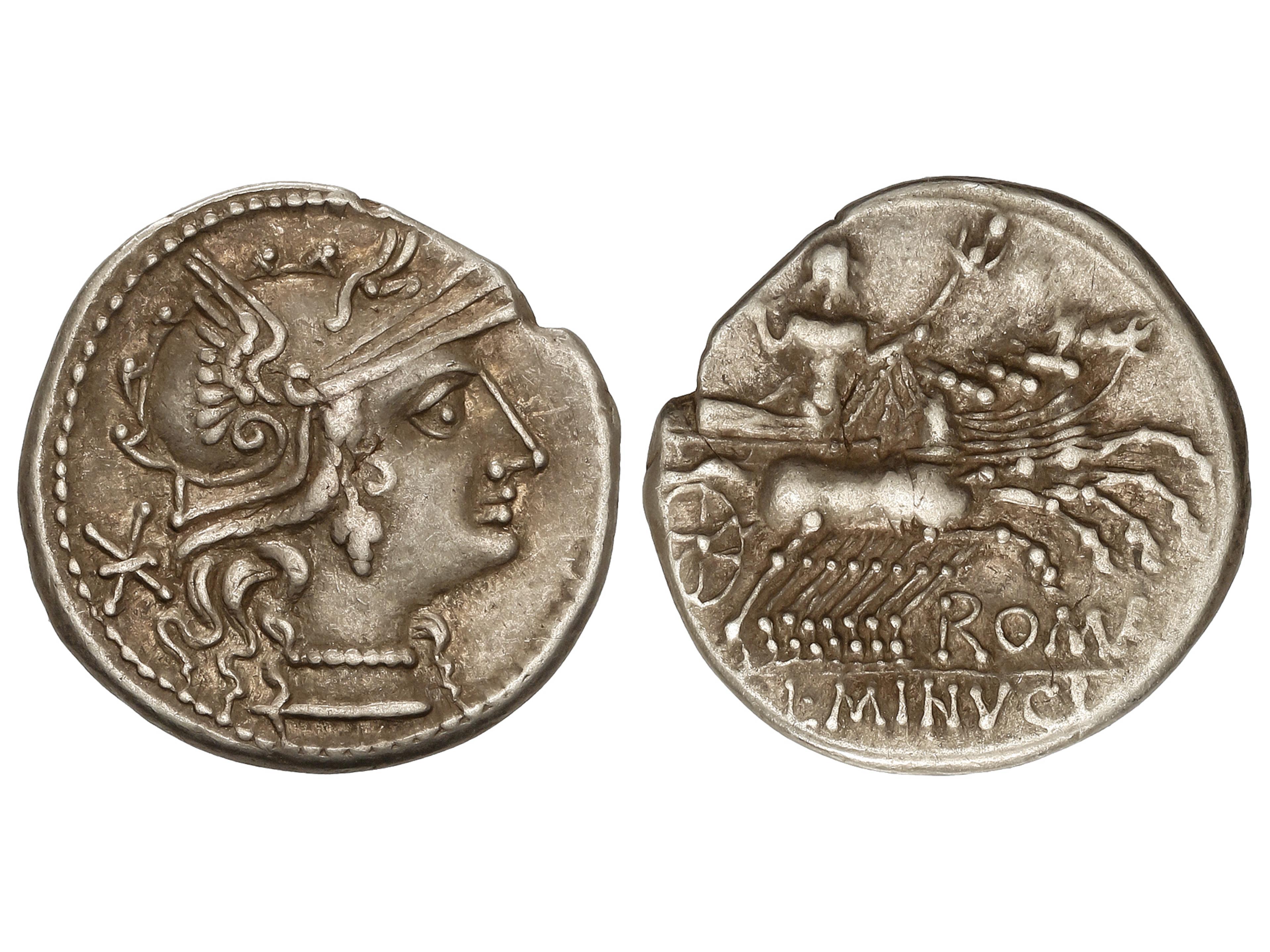Denario. 133 a.C. MINUCIA. L. Minucius Thermus. Anv.: Cabeza de Roma a derecha, detrás estrella. Rev.: Júpiter en cuadriga a derecha, debajo ROMA. En exergo L. MINVCI. 3,81 grs. AR. BMC-963; Cal-1023;