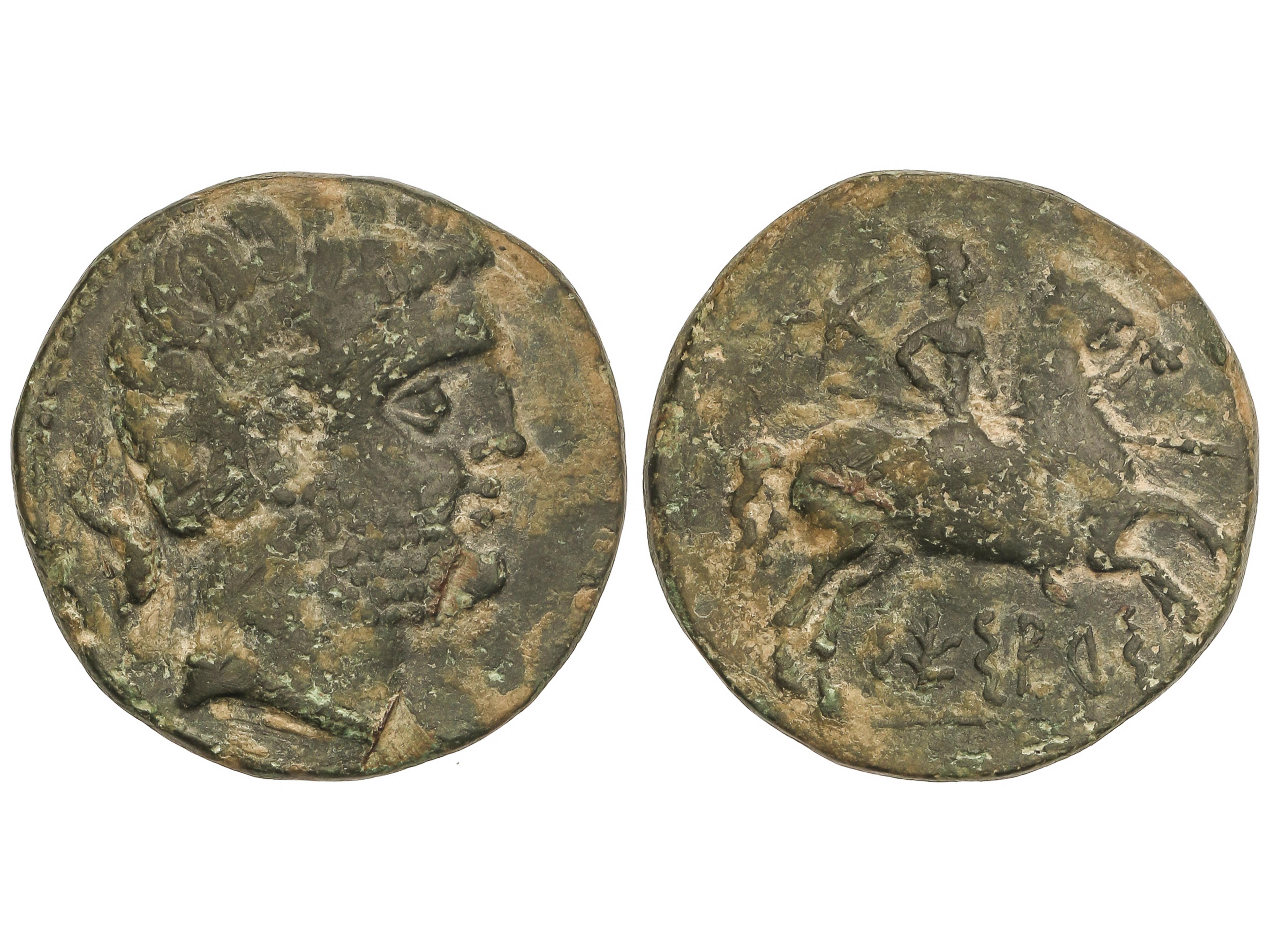 1243 imageAs. CESE (TARRAGONA). Anv.: Cabeza masculina a derecha, detrás timón. Rev.: Jinete a derecha con palma. 11,84 grs. AE. AB-2272. BC+. (Image1)