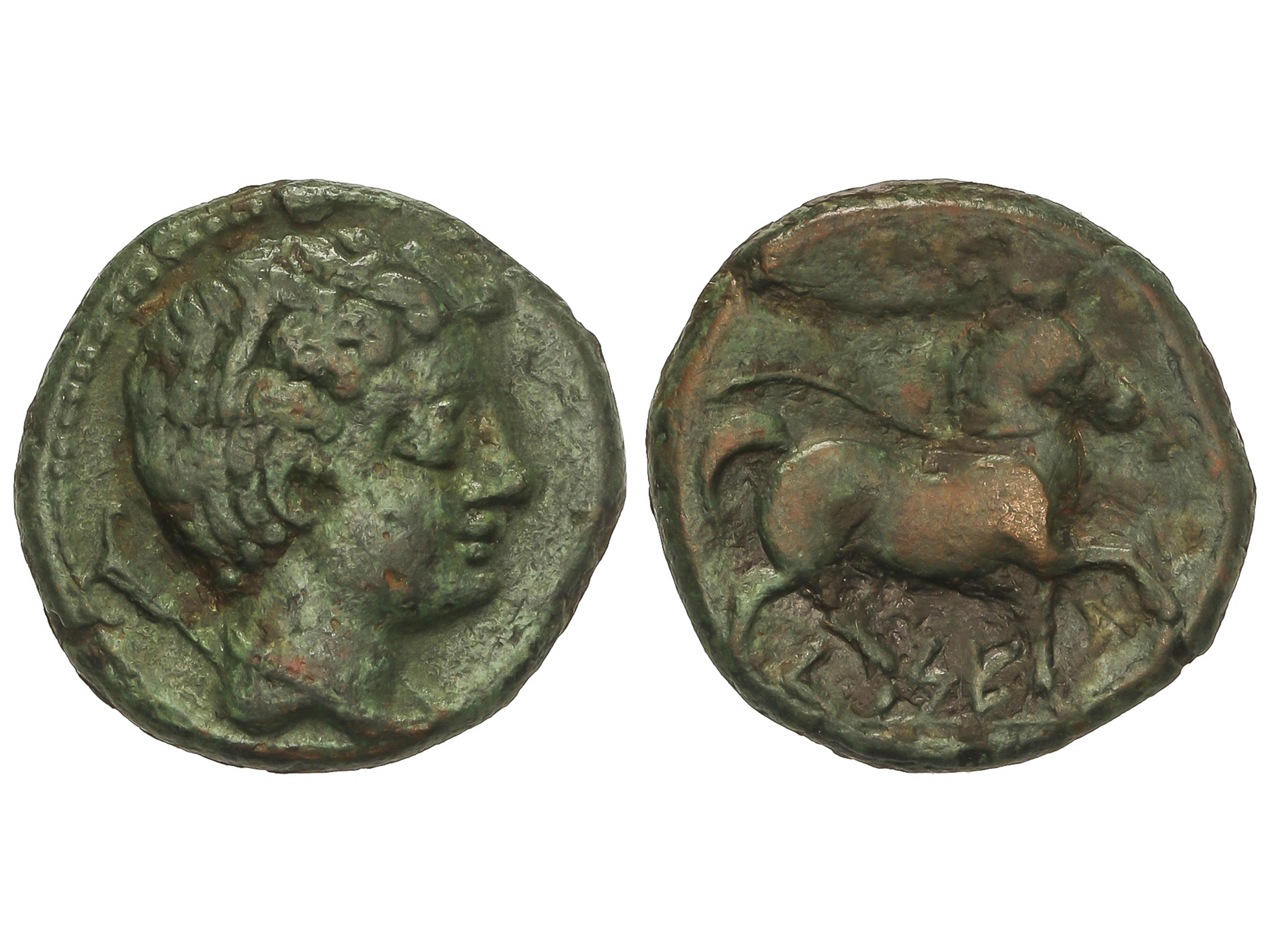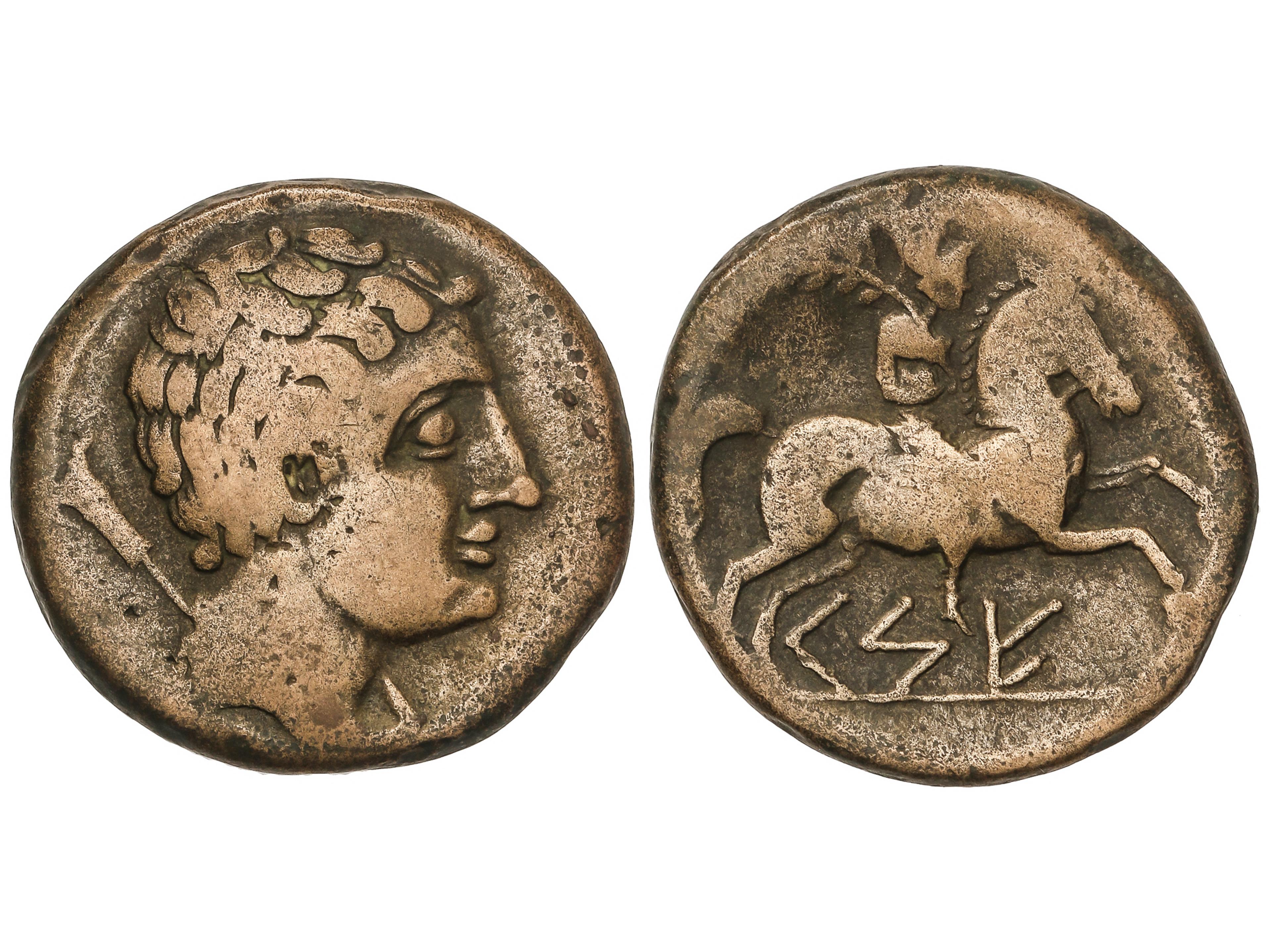 1244 imageSemis. 120-20 a.C. CESE (TARRAGONA). Anv.: Cabeza masculina a derecha, detrás timón. Rev.: Caballo al trote a derecha. 5,36 grs. Pátina. AB-2310. MBC. (Image1)
