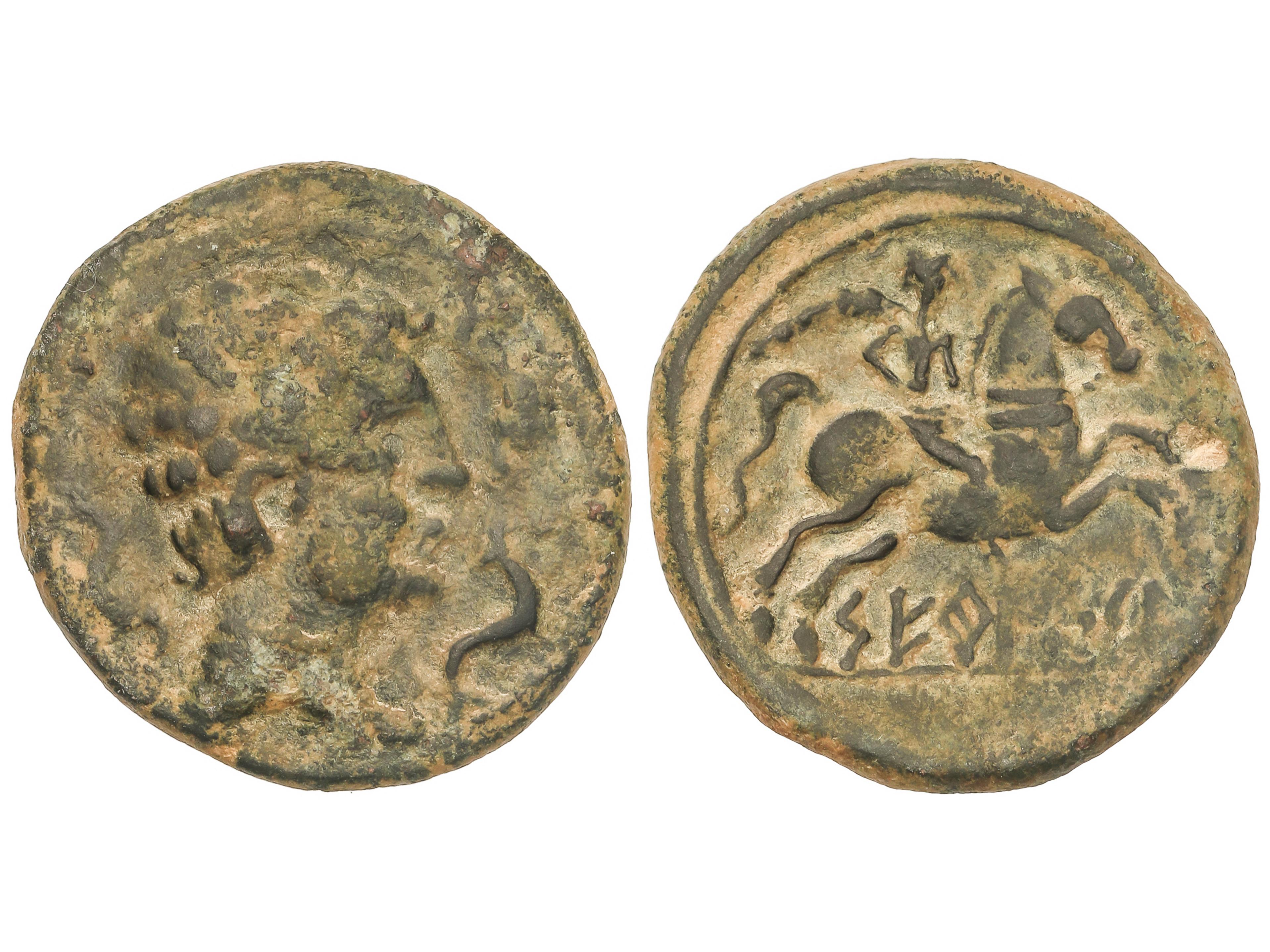1241 imageAs. 120-20 a.C. SETEISCEN (SÁSTAGO, Zaragoza). Anv.: Cabeza masculina a derecha, rodeada de tres delfines. Rev.: Jinete con palma a derecha, debajo leyenda ibérica. 11,12 grs. AE. Pátina. AB-2206; ACIP-1462. MBC-/MBC. (Image1)
