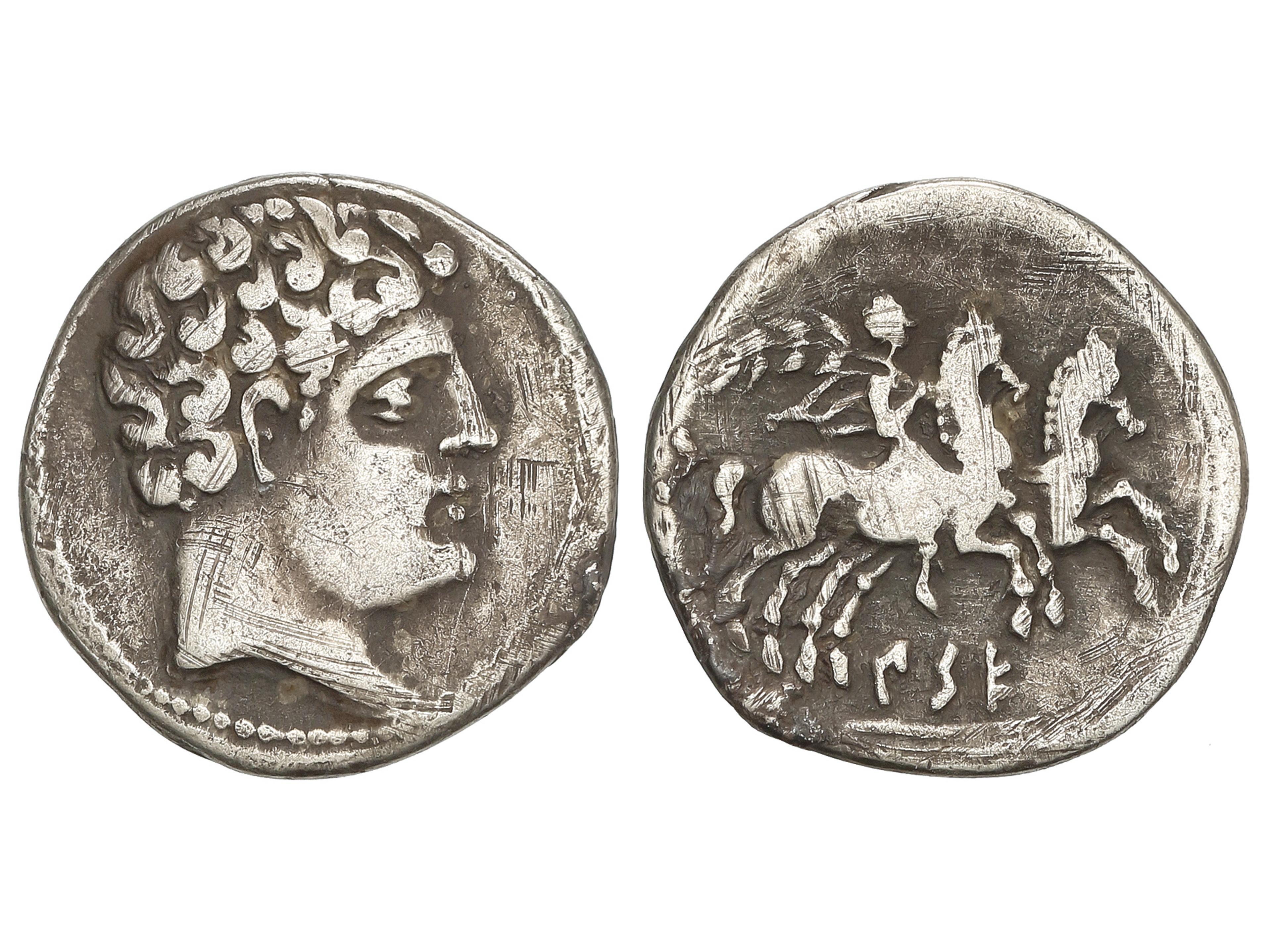 1242 imageDenario. 120-20 a.C. CESE (TARRAGONA). Anv.: Cabeza imberbe a derecha. Rev.: Jinete con palma a derecha conduciendo un segundo caballo, debajo leyenda ibérica CeSE sobre linea. 3,74 grs. AR. (Rayas). Pátina. ESCASA. AB-2266; Vill-17. MBC-. (Image1)