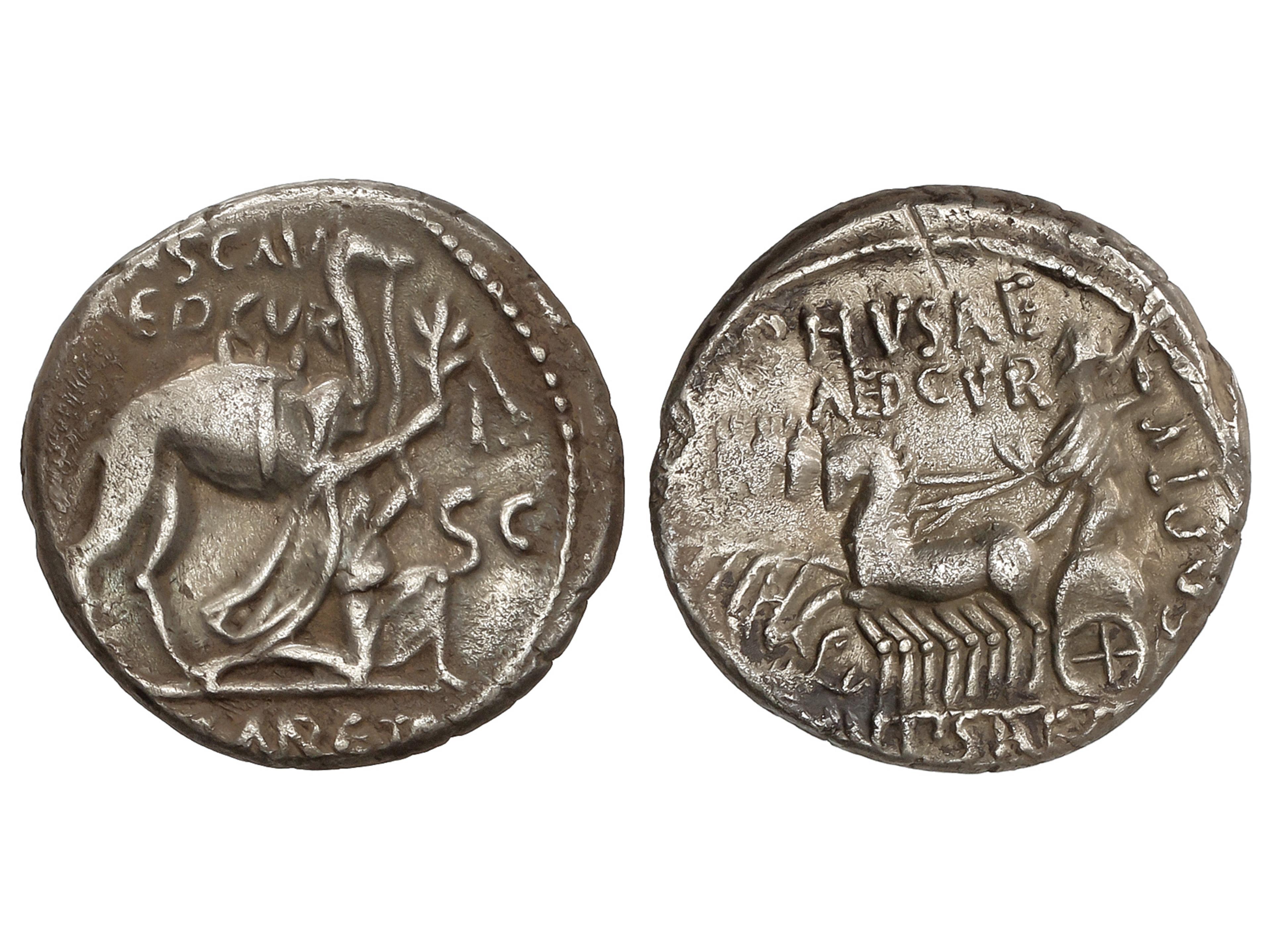 1249 imageDenario. 58 a.C. AEMILIA. M. Aemilius Scaurus y Pub. Plautius Hypsaeus. Anv.: M. SCAVR. AED. CVR., a los lados (EX) SC. En exergo: (REX) ARETAS. Rey Aretas de rodillas a derecha, detrás camello. Rev.: P. HVPSAE AED. CVR. En exergo: C. HVPSAE. (COS. PREIVE). Júpiter en cuadriga a izquierda escorpión bajo los caballos. 3,63 grs. AR. BMC-3878; Cal-89; Craw-422.1b; FFC-123; Se-8. MBC+. (Image1)
