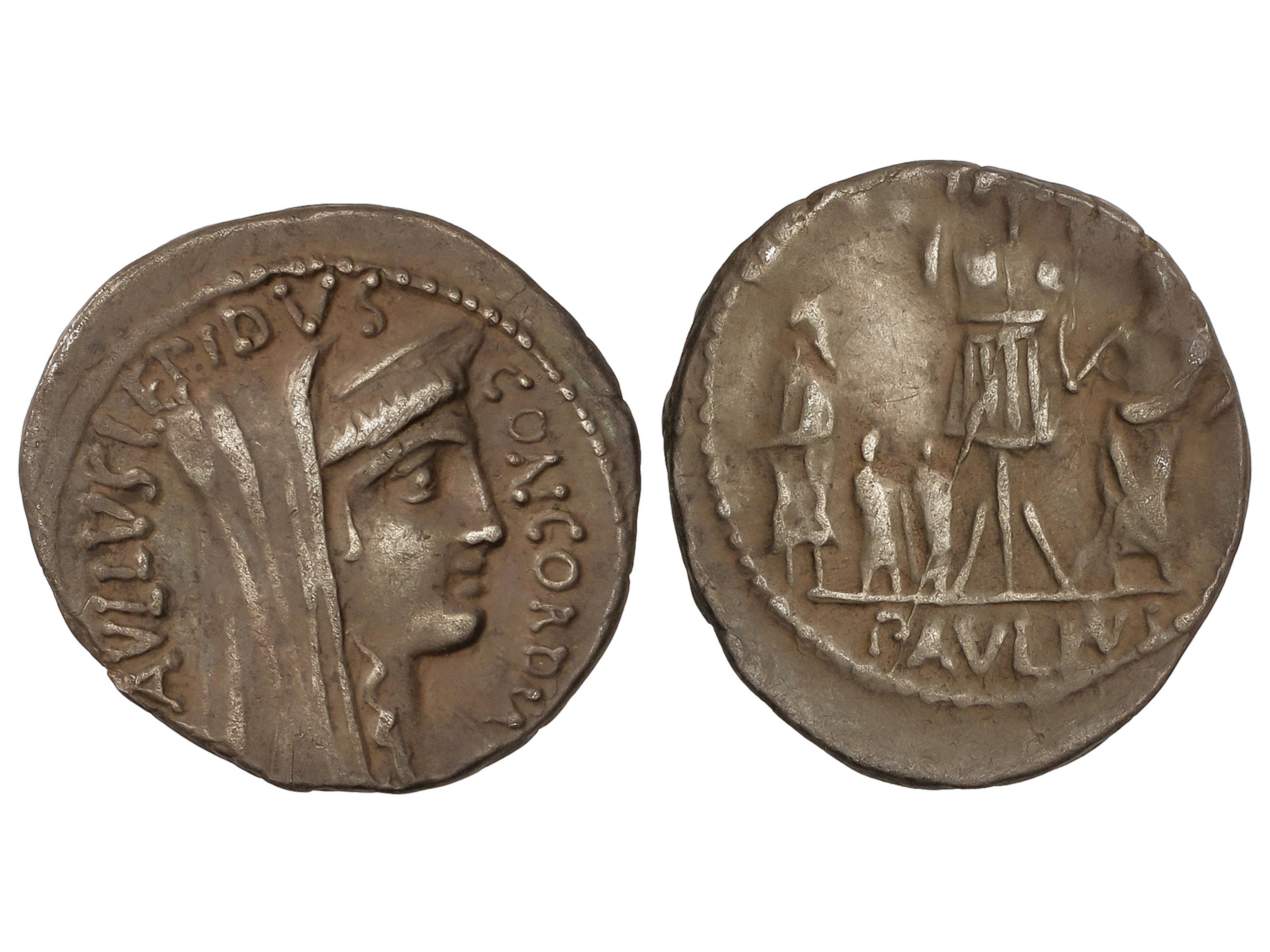 1250 imageDenario. 62 a.C. AEMILIA. Paullus Aemilius Lepidus. Anv.: PAVLLS LEPIDUS CONCORDIA. Cabeza velada y diademada de Concordia a derecha. Rev.: L. Aemilius y Perseo de Macedonia con sus dos hijos en medio trofeo, encima: (TER). En exergo: PAVLLVS. 3,68 grs. AR. Pátina. BMC-3376; Craw-415/1v; FFC-127. MBC. (Image1)