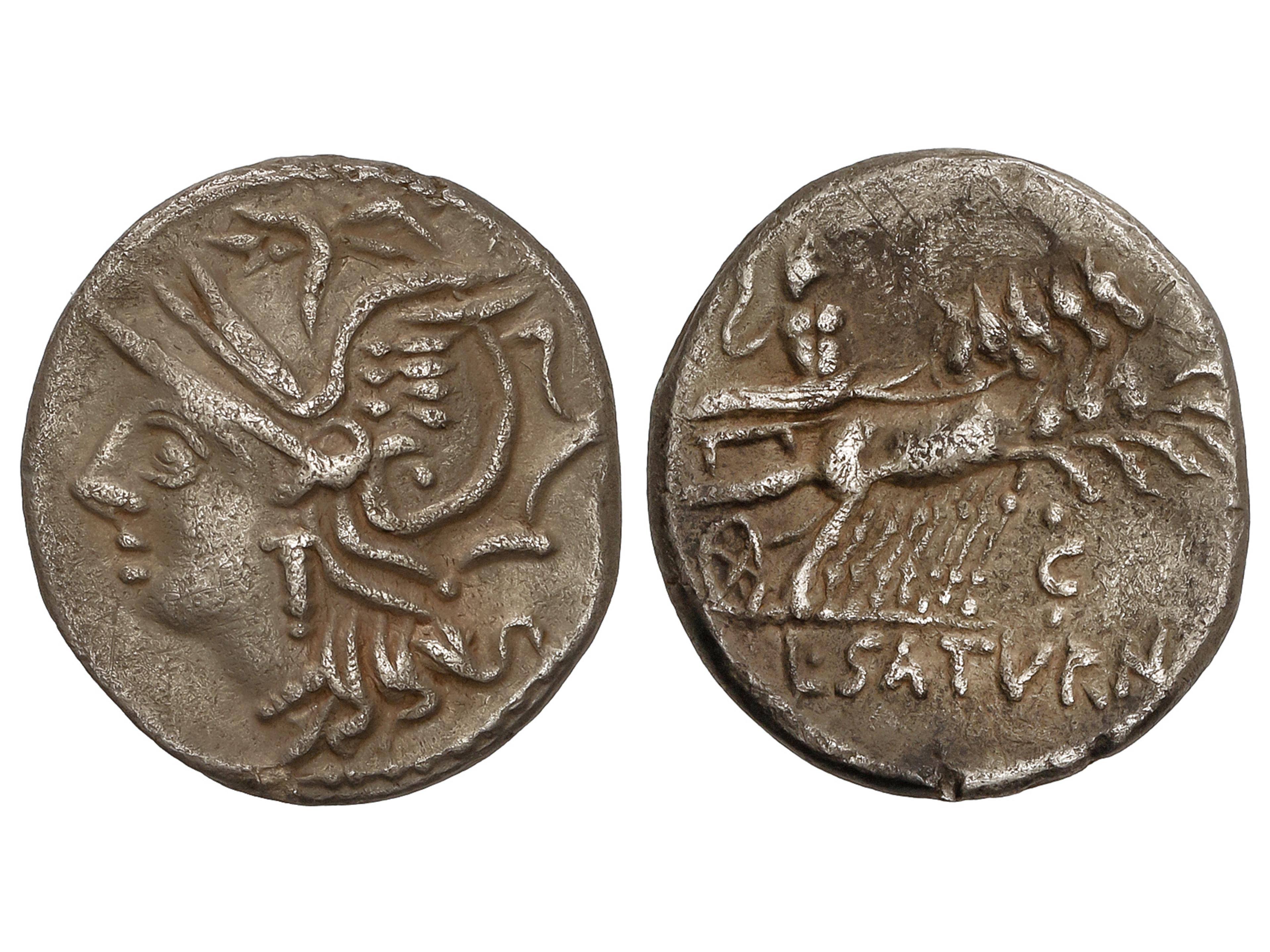 1253 imageDenario. 104 a.C. APPULEIA. Lucius Appuleius Saturninus. Anv.: Cabeza de Roma a izquierda. Rev.: Saturno en cuadriga a derecha, debajo letra C. En exergo: L. SATVRN. 3,69 grs. AR. Ligera pátina. BMC-1523-57; Cal-225; Craw-317/3b; FFC-161; Se-1. MBC+/MBC. (Image1)