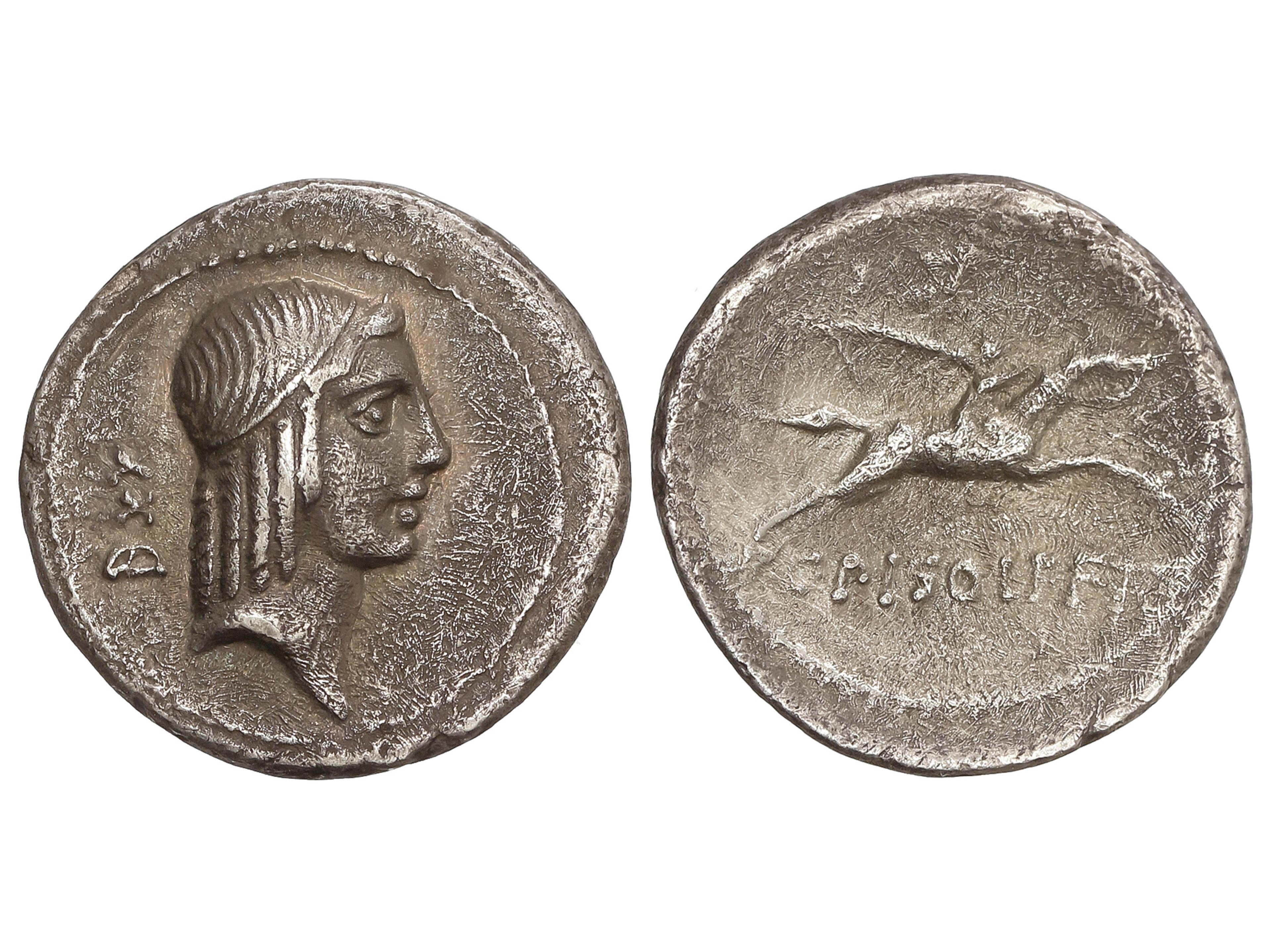 1259 imageDenario. 64 a.C. CALPURNIA. C. Calpurnius Piso Frugi. Anv.: Cabeza laureada de Apolo a derecha, detrás número DXX. Rev.: Jinete galopando a derecha, encima símbolo no visible, debajo C. PISO L.F. FRV. 3,15 grs. AR. (Oxidaciones). Cal-342o; FFC-418 sim. MBC+/MBC-. (Image1)