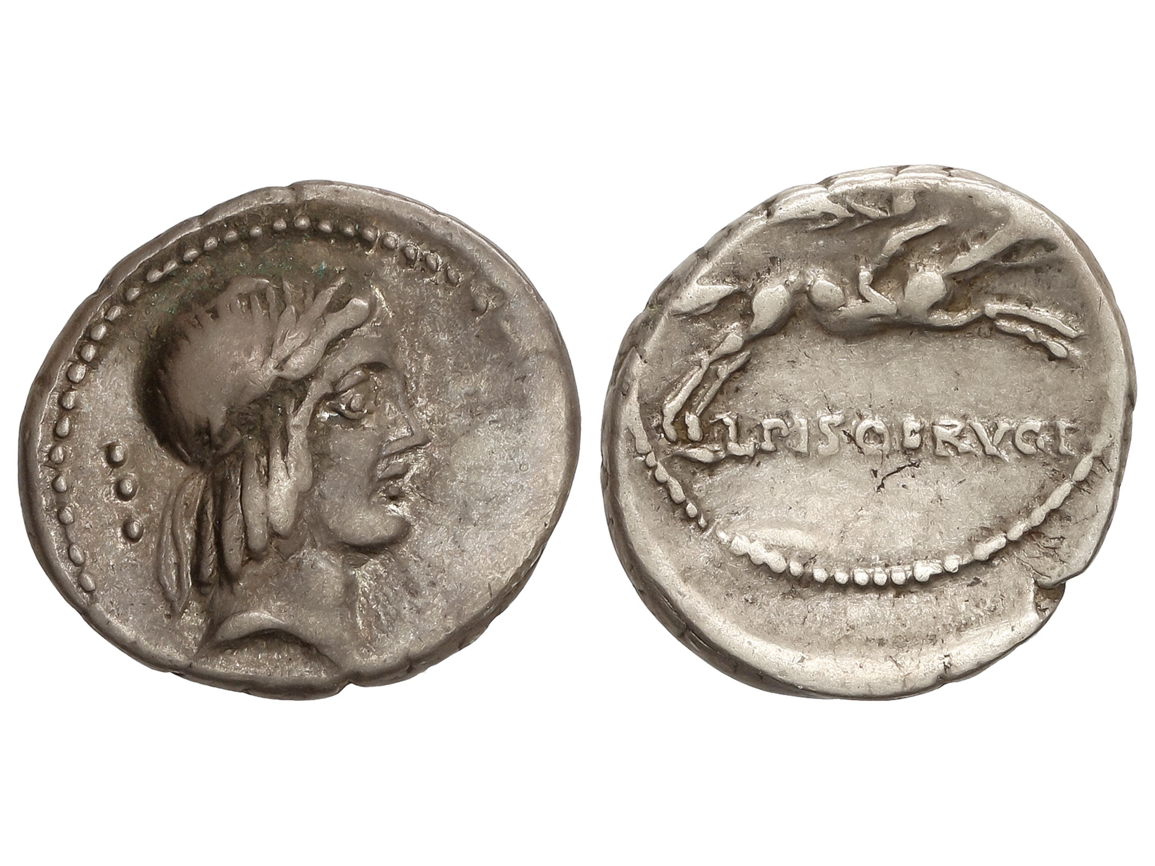 1258 imageDenario. 64 a.C. CALPURNIA. L. Calpurnius Piso Frugi. Anv.: Cabeza laureada de Apolo a derecha, detrás signo fraccionario de 3 puntos. Rev.: Jinete galopando a derecha, encima no visible, debajo L. PISO. FRVGI. 3,78 grs. AR. Pátina. FFC-299 sim. MBC. (Image1)