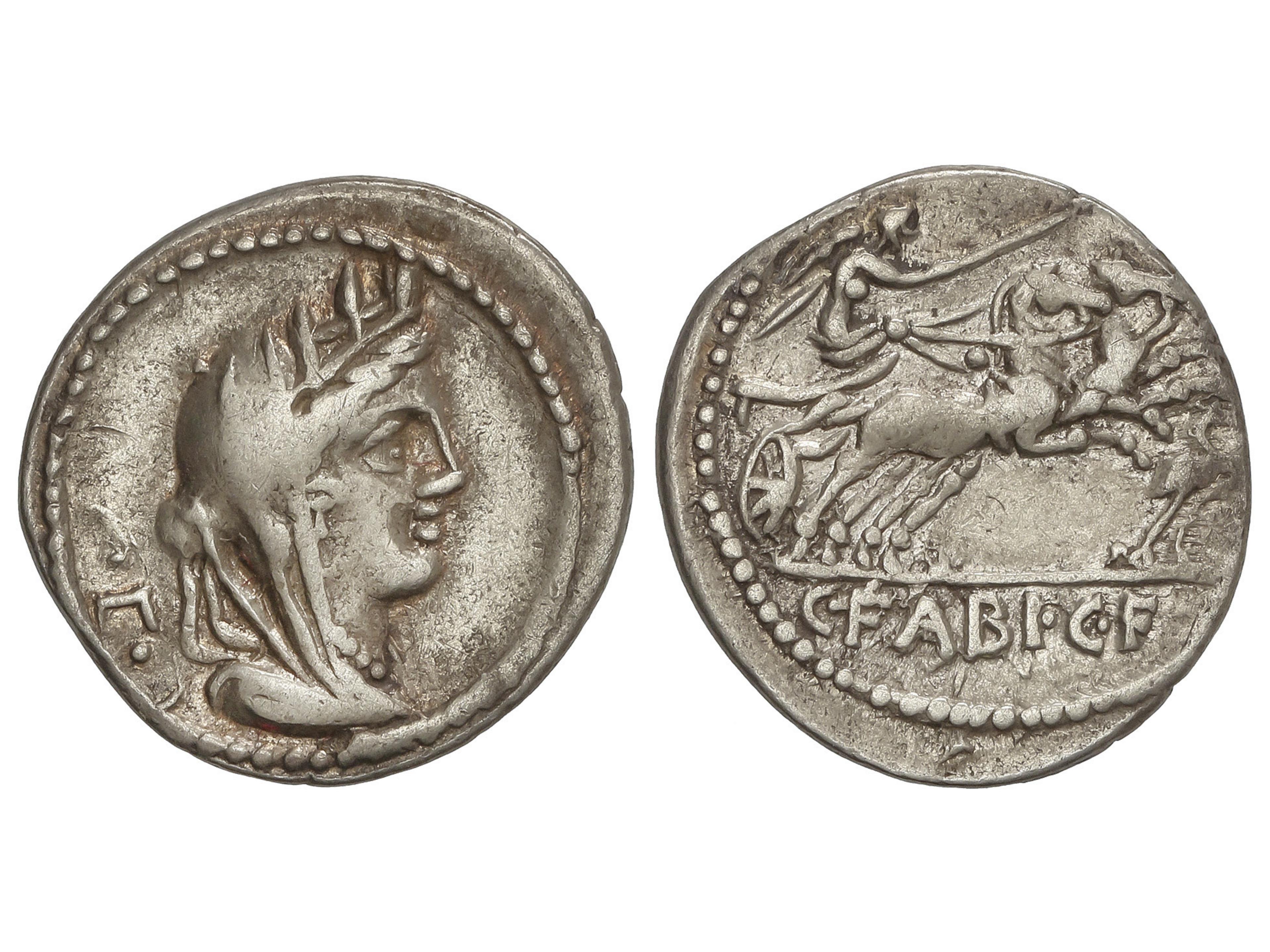 Denario. 104 a.C. FABIA. C. Fabius C.f. Hadrianus. Anv.: Cabeza de Cibeles a derecha, detrás letra griega. Rev.: Victoria en biga a derecha, debajo cigüeña. En exergo: C. FABI. C.F. 3,85 grs. AR. (Leves