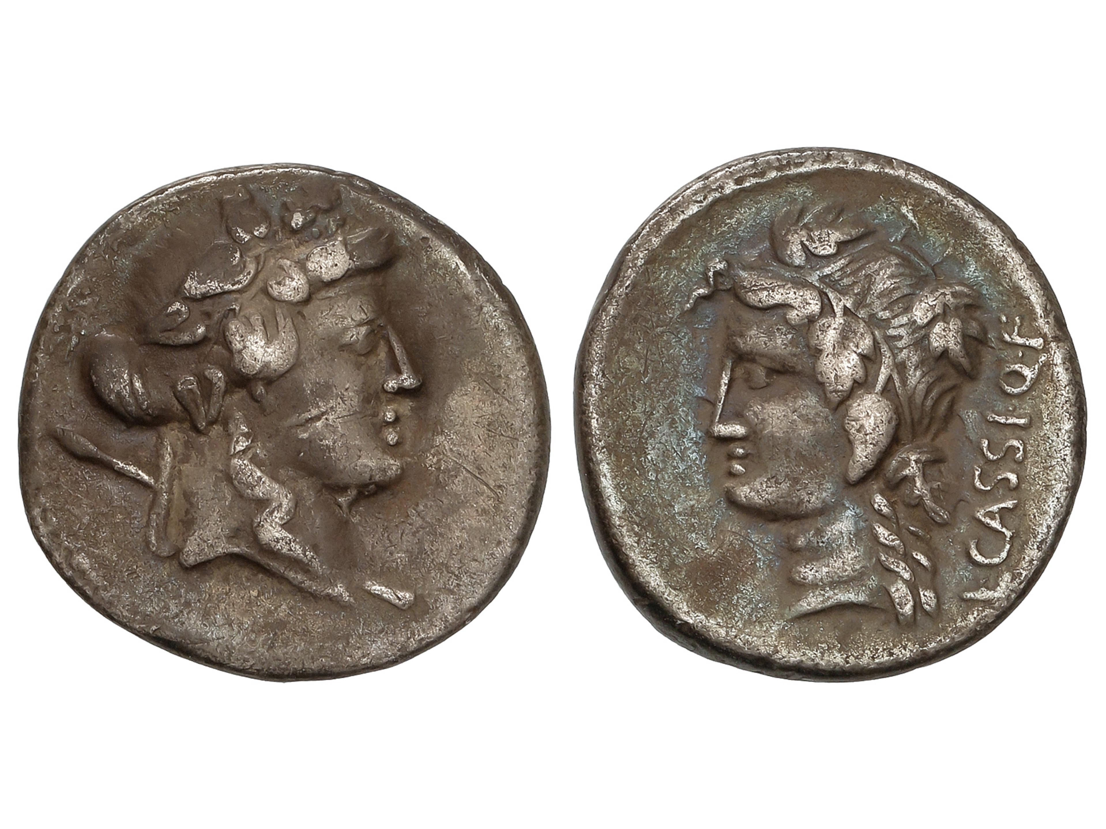 Denario. 78 a.C. CASSIA. L. Cassius Q. F. Longinus. Anv.: Cabeza de Libero Baco a derecha. Rev.: Cabeza diademada de Libera a izquierda, detrás L. CASSI. Q. F. 3,64 grs. AR. Pátina. BMC-3152; Cal-410;