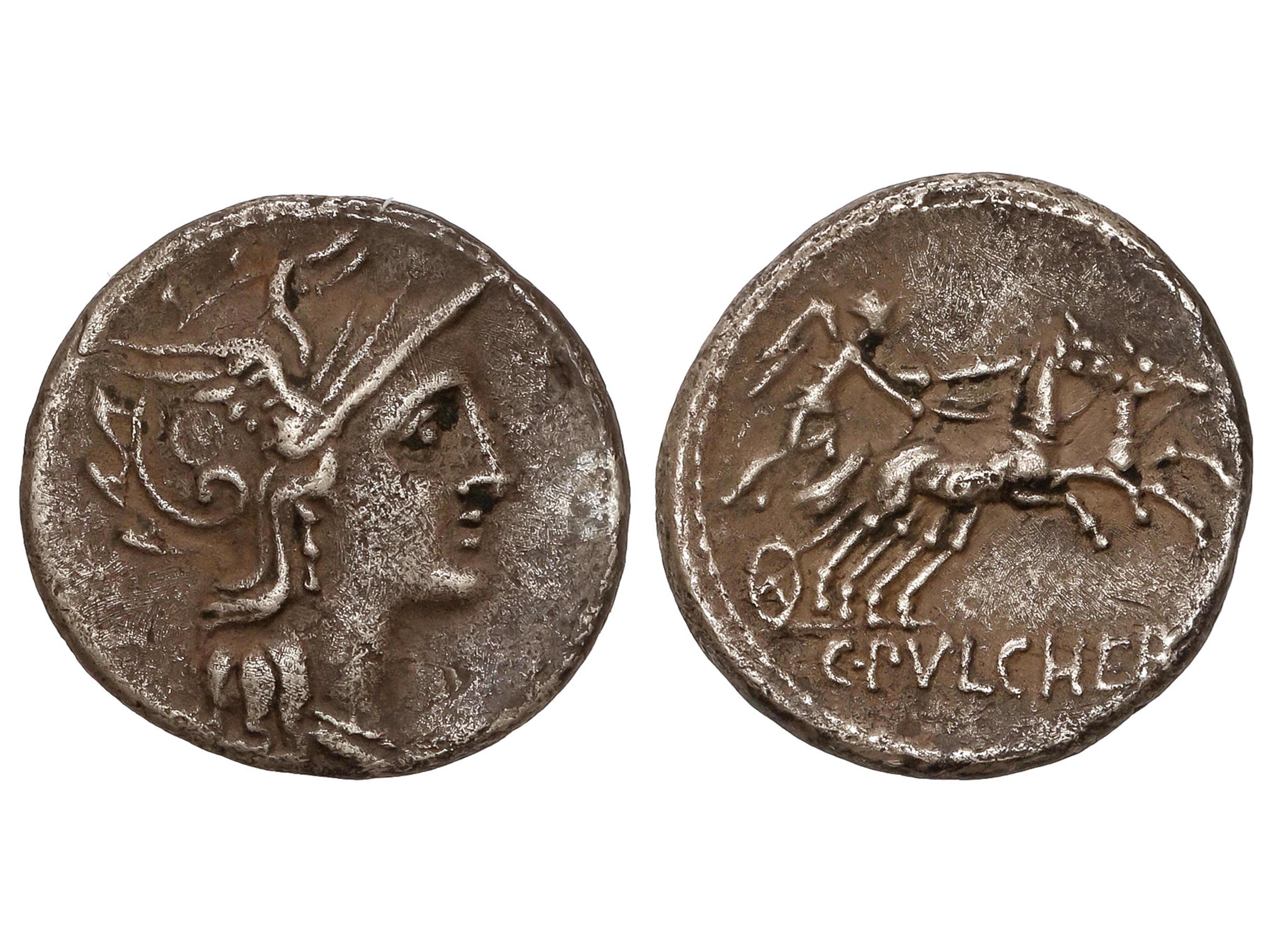 Denario. 110-109 a.C. CLAUDIA. C. Claudius Pulcher. Anv.: Cabeza de Roma a derecha. Rev.: Victoria en biga a derecha. En exergo: C. PVLCHER. 3,56 grs. AR. (Oxidaciones). Pátina. BMC-1288; Cal-424; Craw-300/1;
