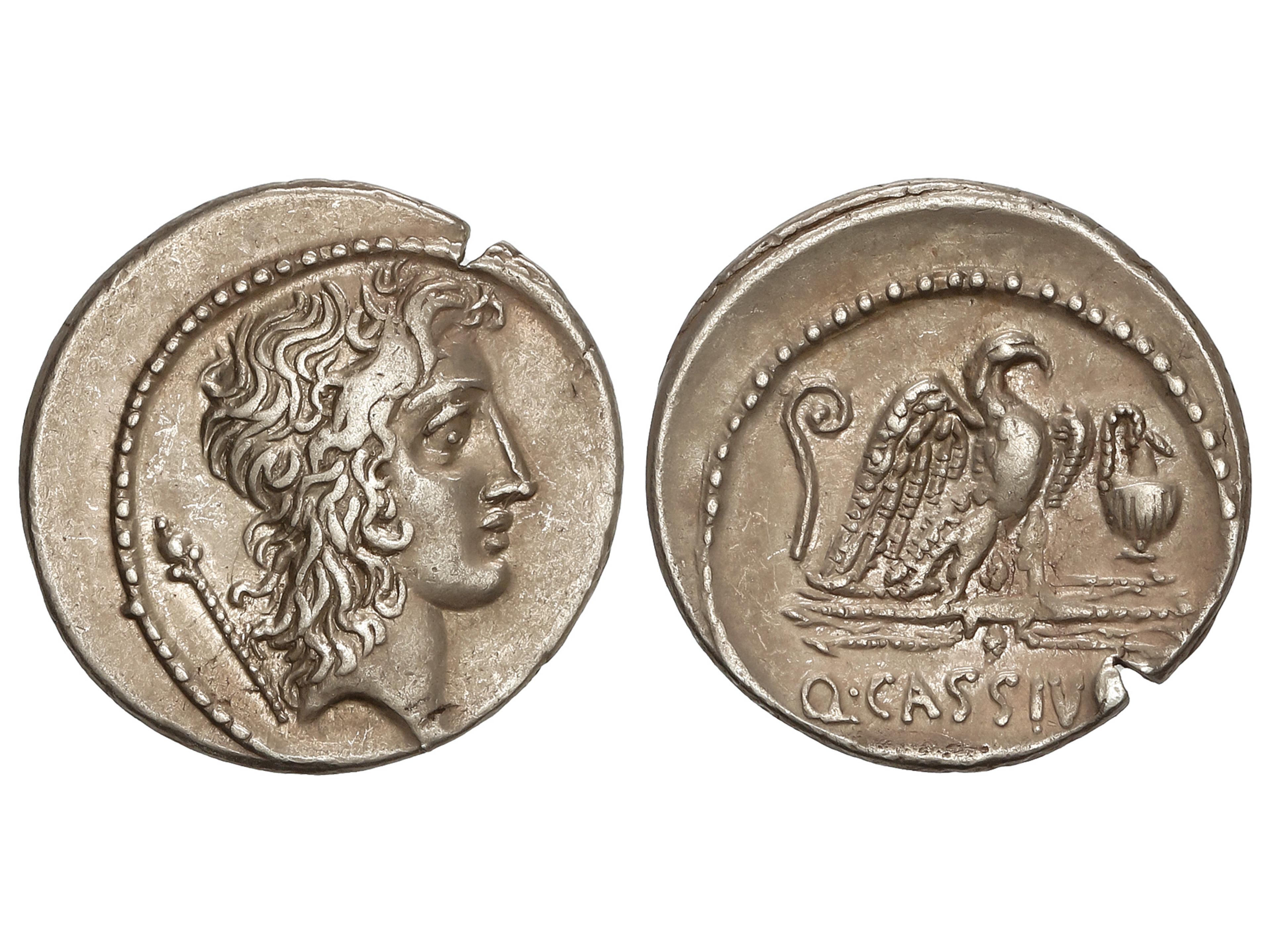 Denario. 55 a.C. CASSIA. Q. Cassius Longinus. Anv.: Cabeza de Bonus Eventus a derecha, detrás cetro. Rev.: Águila a derecha, entre lituo y praeferículo, debajo Q. CASSIVS. 3,77 grs. AR. (Golpe cizalla en