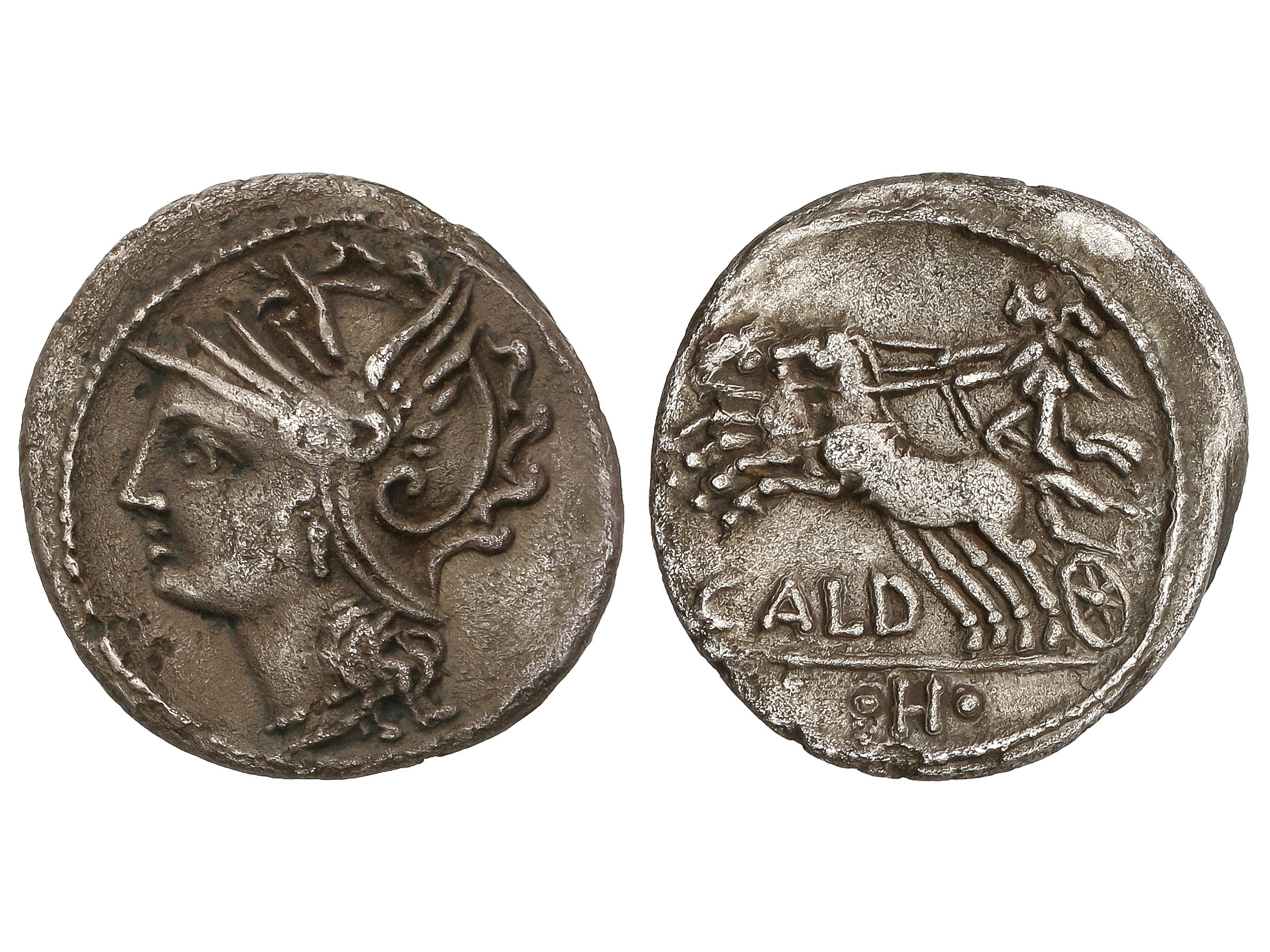 Denario. 104 a.C. COELIA o COILIA. C. Coelius Caldus. Anv.: Cabeza de Roma a izquierda. Rev.: Victoria en biga a izquierda, debajo CALD, En exergo: letra H. 3,56 grs. AR. (Oxidaciones). Pátina. BMC-1463-92;