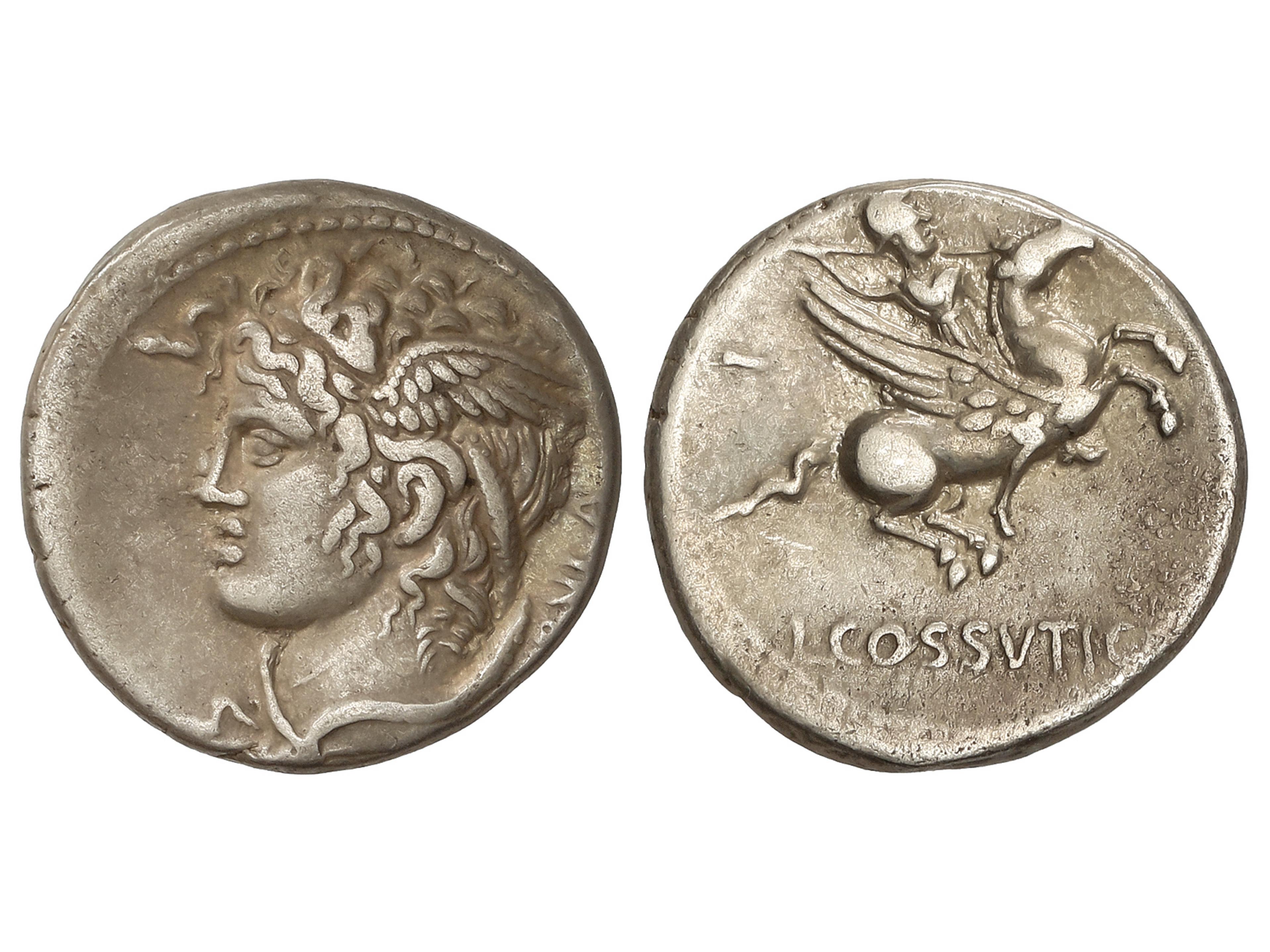 Denario. 74 a.C. COSSUTIA. L. Cossutius C.f Sabula. Anv.: Cabeza alada de Medusa a izquierda, detrás (SA)BVLA. Rev.: Ballerophon montando Pegaso a derecha, a izquierda número X, debajo L. COSSVTI. (C.F.). 3,91