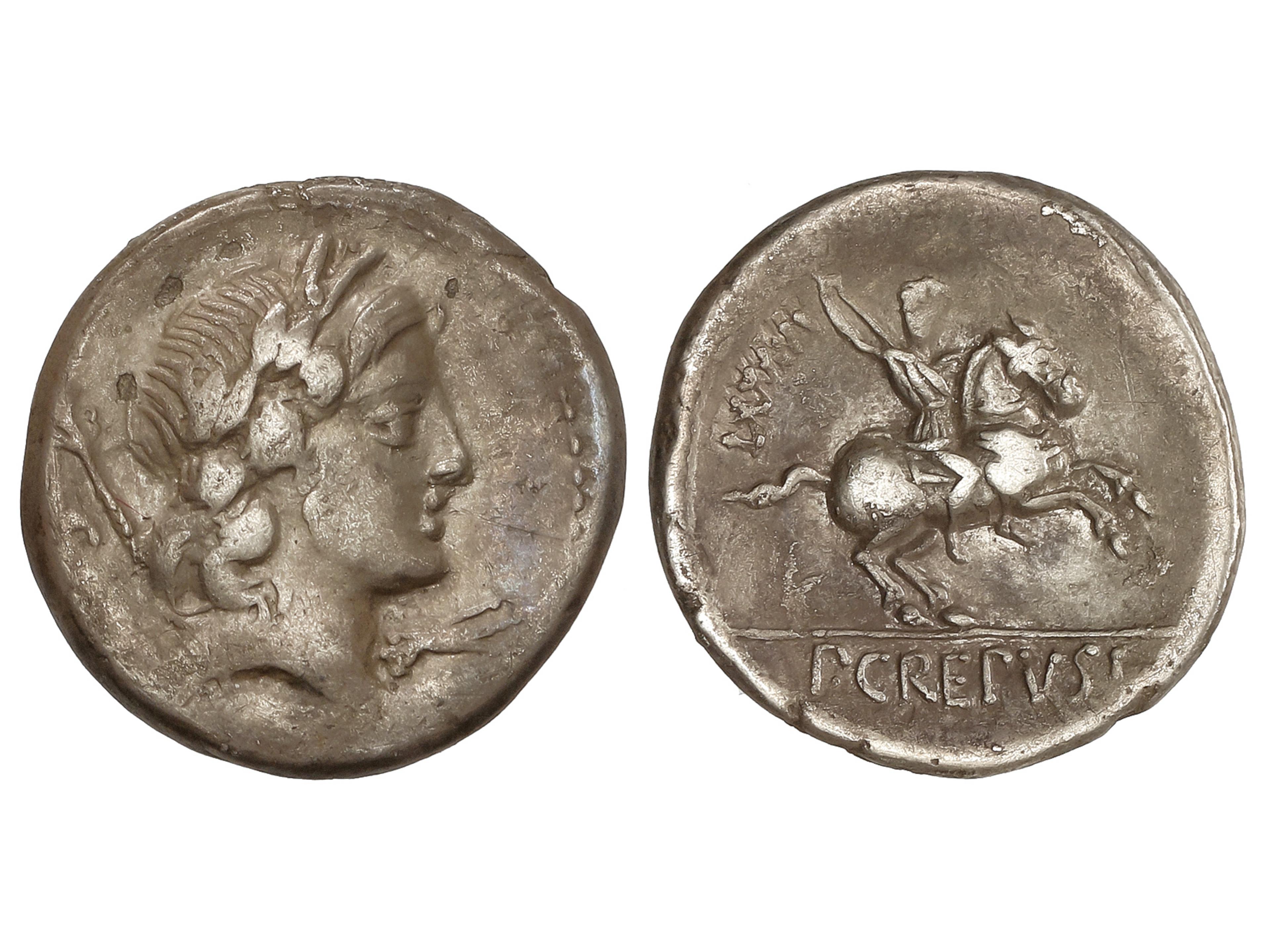 Denario. 82 a.C. CREPUSIA. Publius Crepusius. Anv.: Cabeza laureada de Apolo a derecha, delante símbolo, detrás cetro. Rev.: Jinete con lanza a derecha, detrás número. En exergo: P. CREPVSI. 3,60 grs. AR.