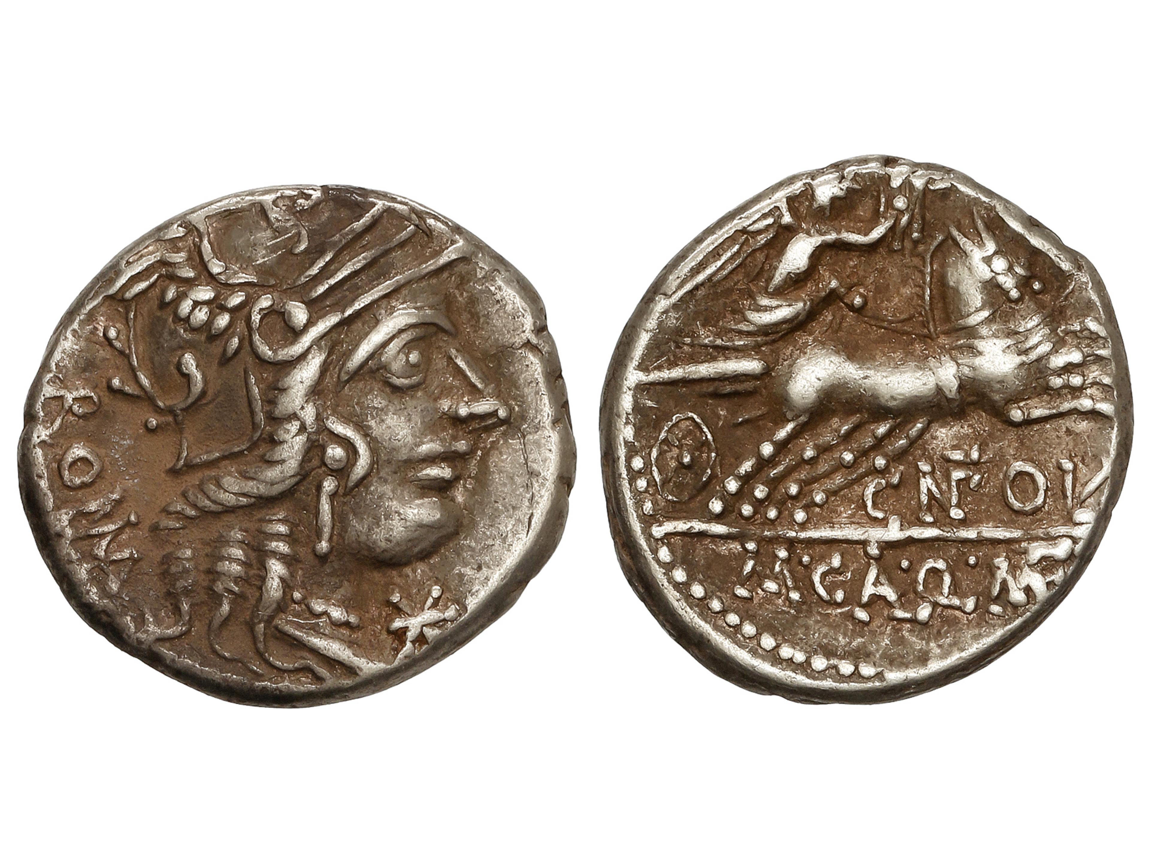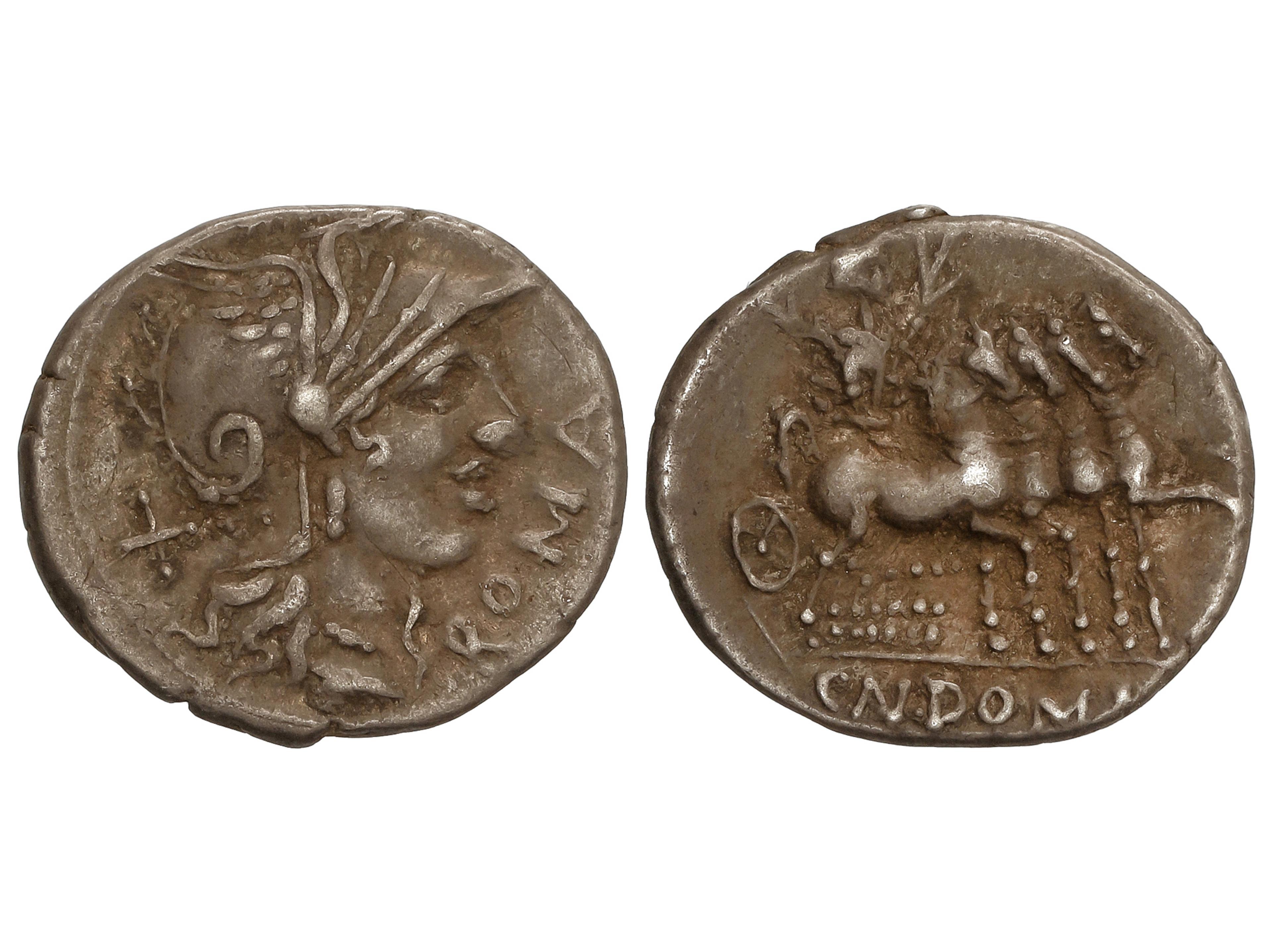 Denario. 116-115 a.C. DOMITIA. Cnaeus Domitius Ahenobarbus. Anv.: Cabeza de Roma entre X y ROMA. Rev.: Júpiter en cuadriga a derecha, debajo CN.DOMI. 3,88 grs. AR. Pátina. BMC-490; Cal-544; Craw-285-1; FFC-681;