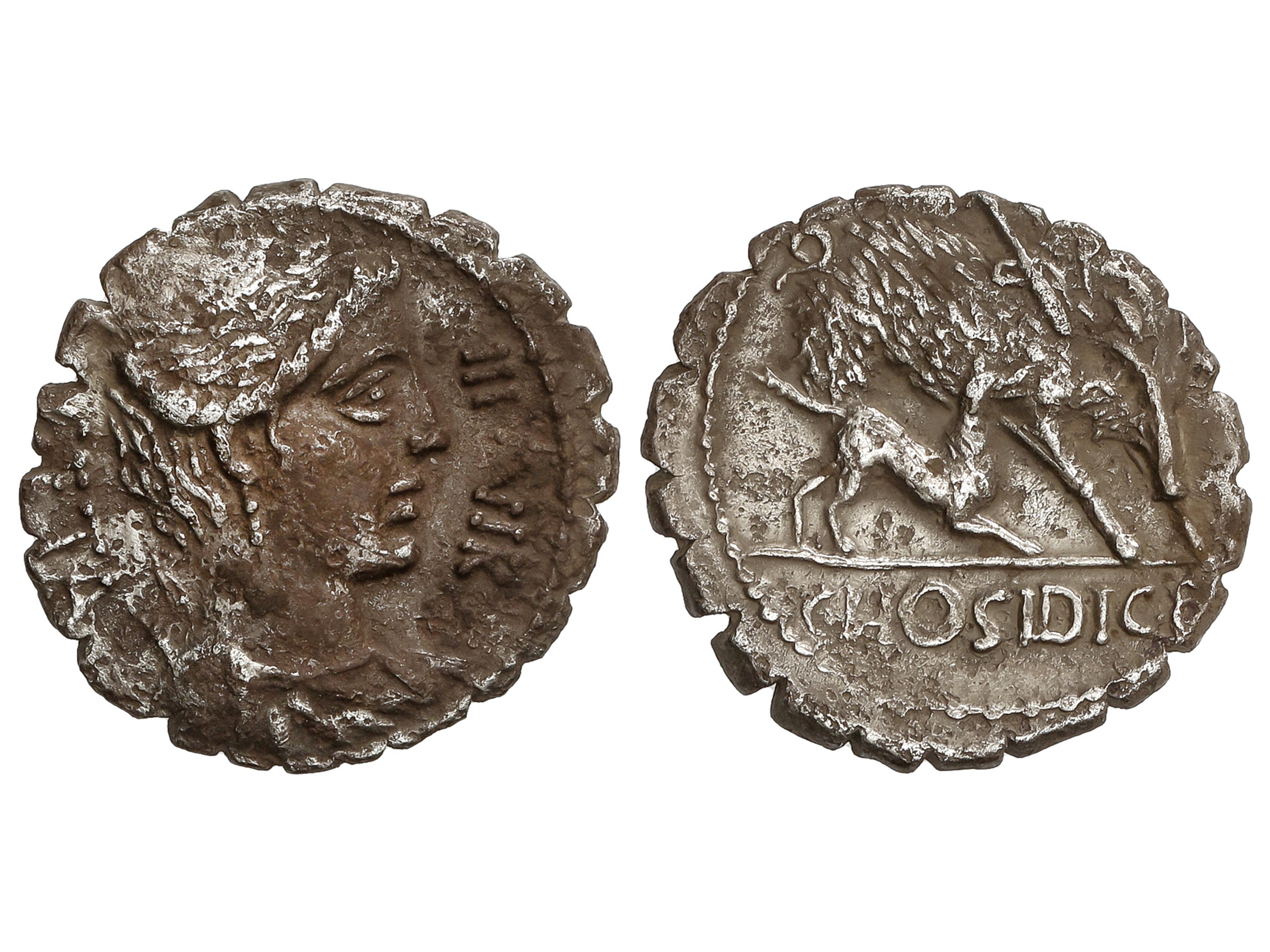 Denario. 68 a.C. HOSIDIA. C. Hosidius C.f. Geta. Anv.: Busto sin diadema de Diana a derecha con arco y carcaj. Leyendas invertidas III VIR-GETA. Rev.: Jabalí a derecha atravesado por una flecha y atacado por un