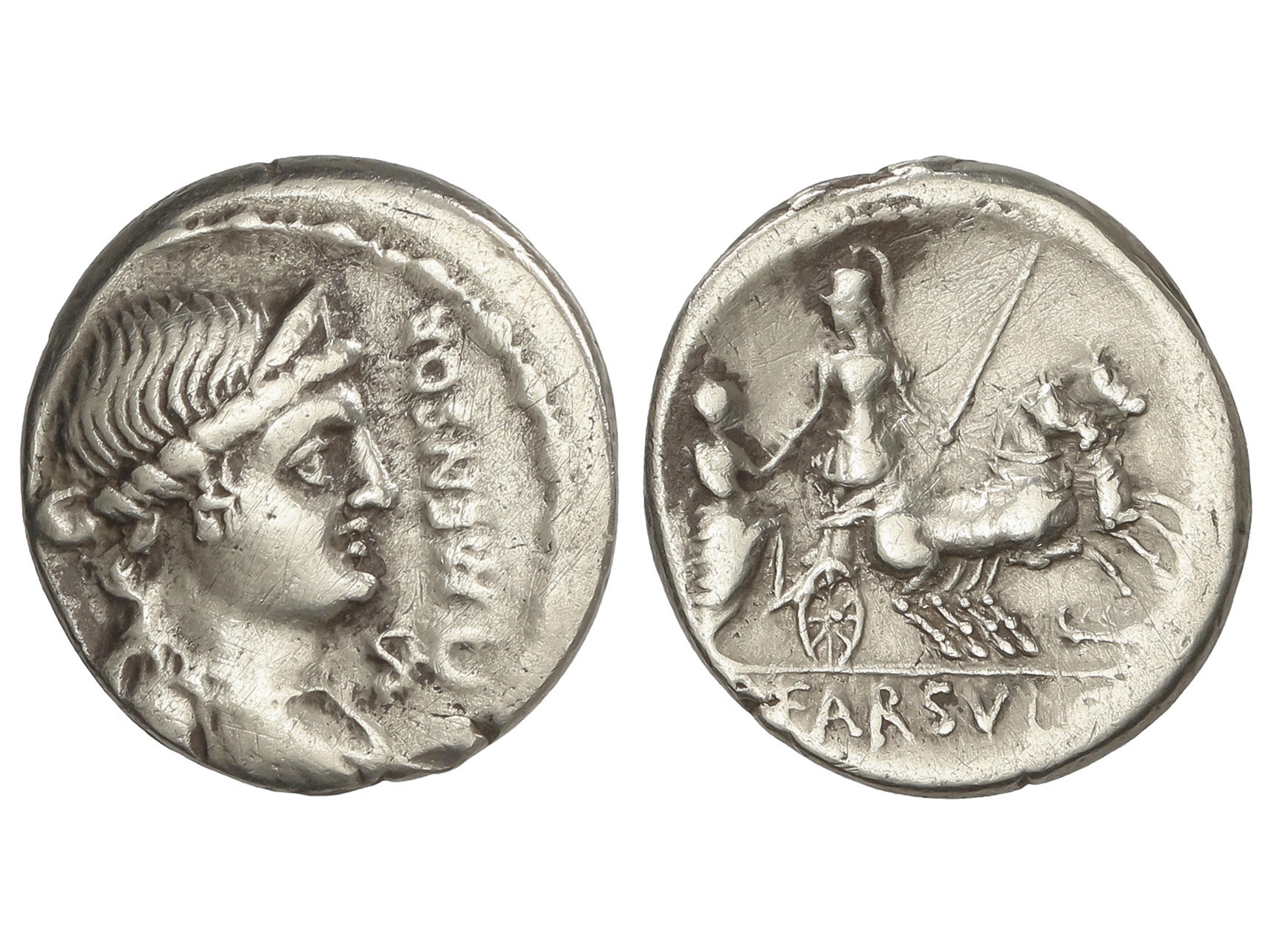 Denario. 75 a.C. FARSULEIA. L. Farsuleius Mensor. Anv.: Busto diademado de la libertad a derecha, delante: MENSOR, bajo el mentón: S.C. Rev.: Guerrero con lanza en biga a derecha y personaje montando en el