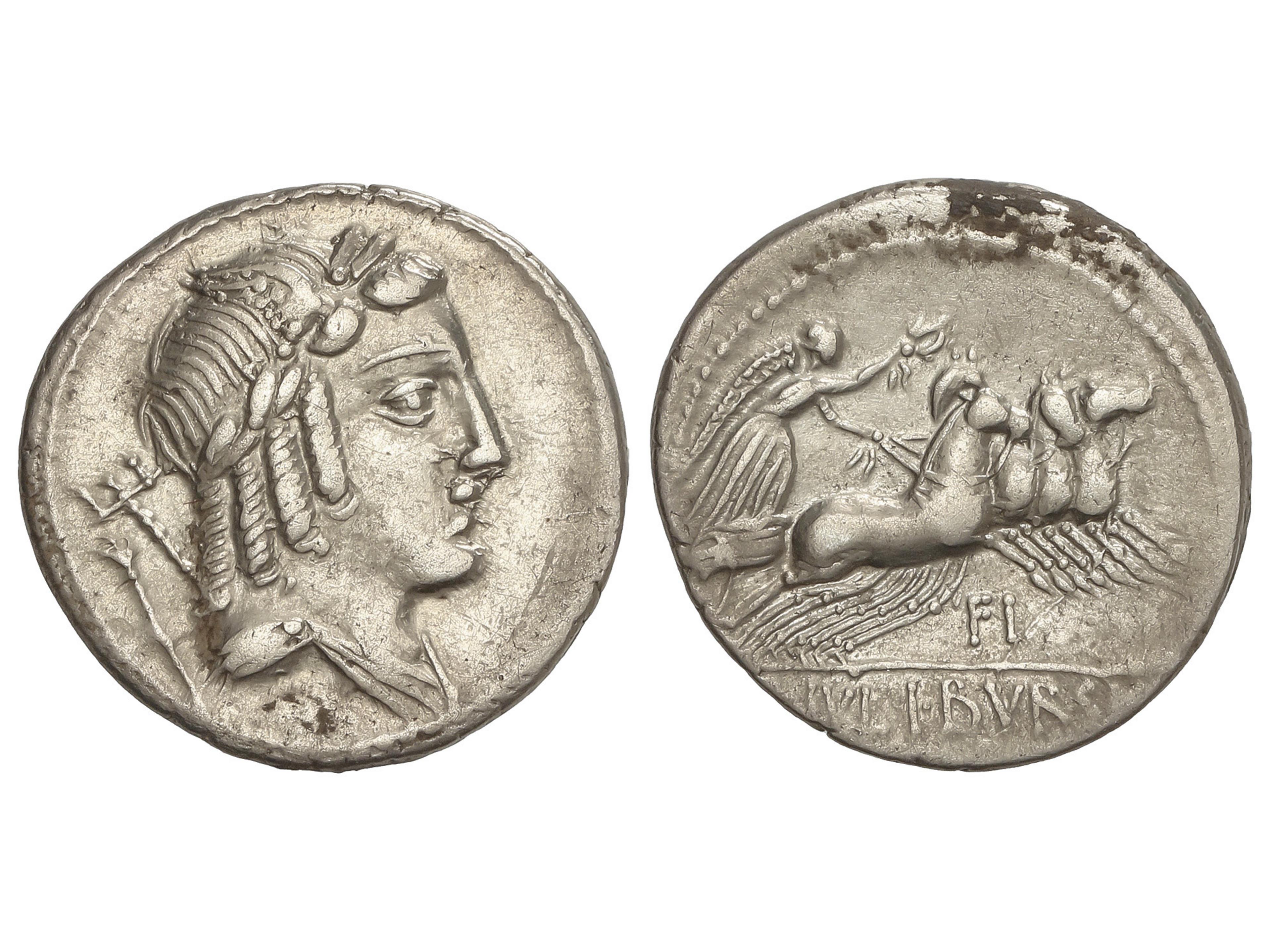 Denario. 85 a.C. JULIA. L. Julius Bursio. Anv.: Cabeza de Apolo Vejovis a derecha, detrás tridente y símbolo. Rev.: Victoria en cuadriga a derecha, debajo FI letras. En exergo: L. IVLI. BVRSIO. 4,04 grs. AR.