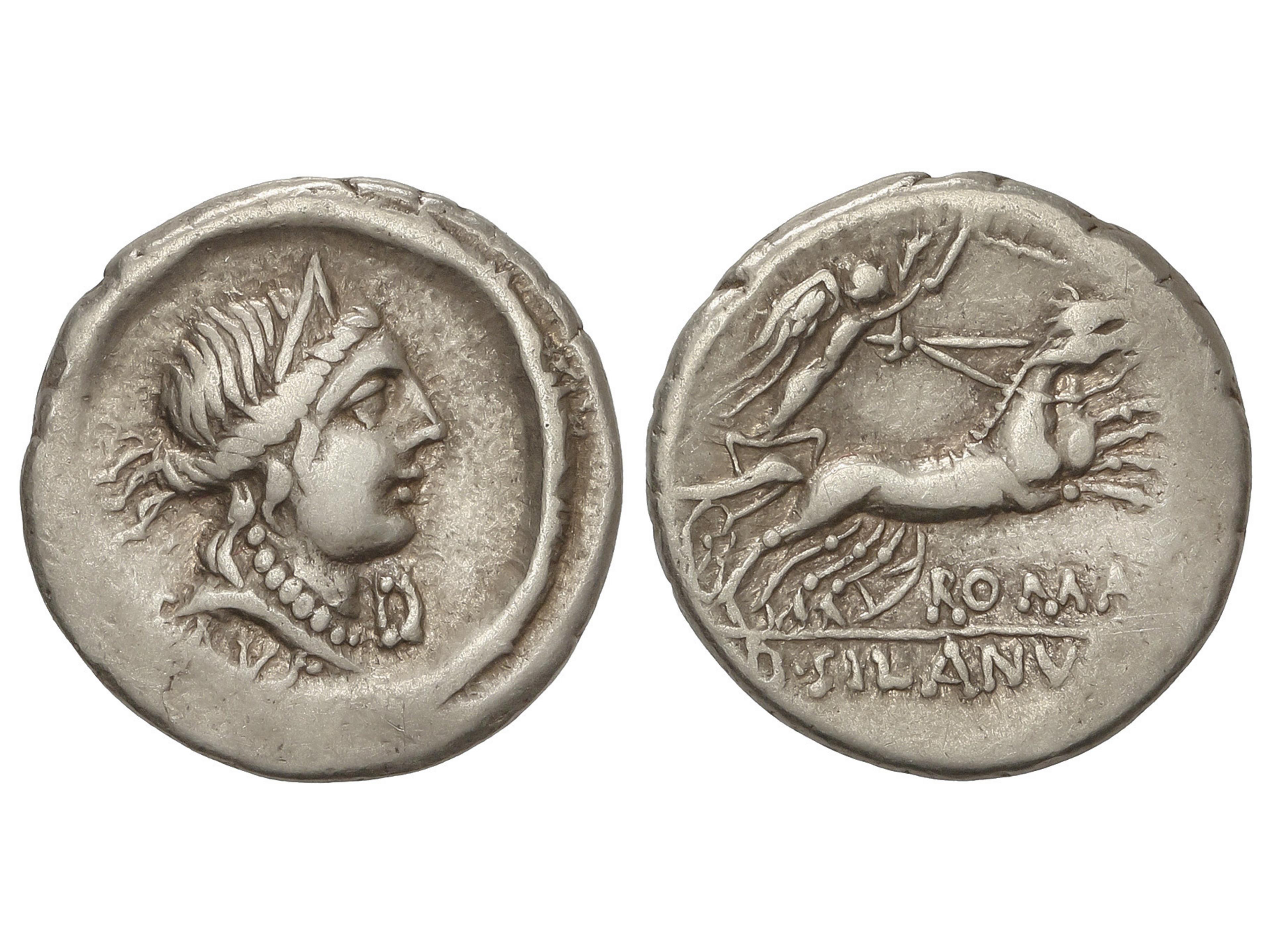 Denario. 91 a.C. JUNIA. D. Junius Silanus L.f. Anv.: Cabeza de Salud a derecha, debajo (SALVS), debajo la barbilla letra D. Rev.: Victoria en biga a derecha, debajo ROMA. En exergo: D. SILANVS. (L. F.). 3,63