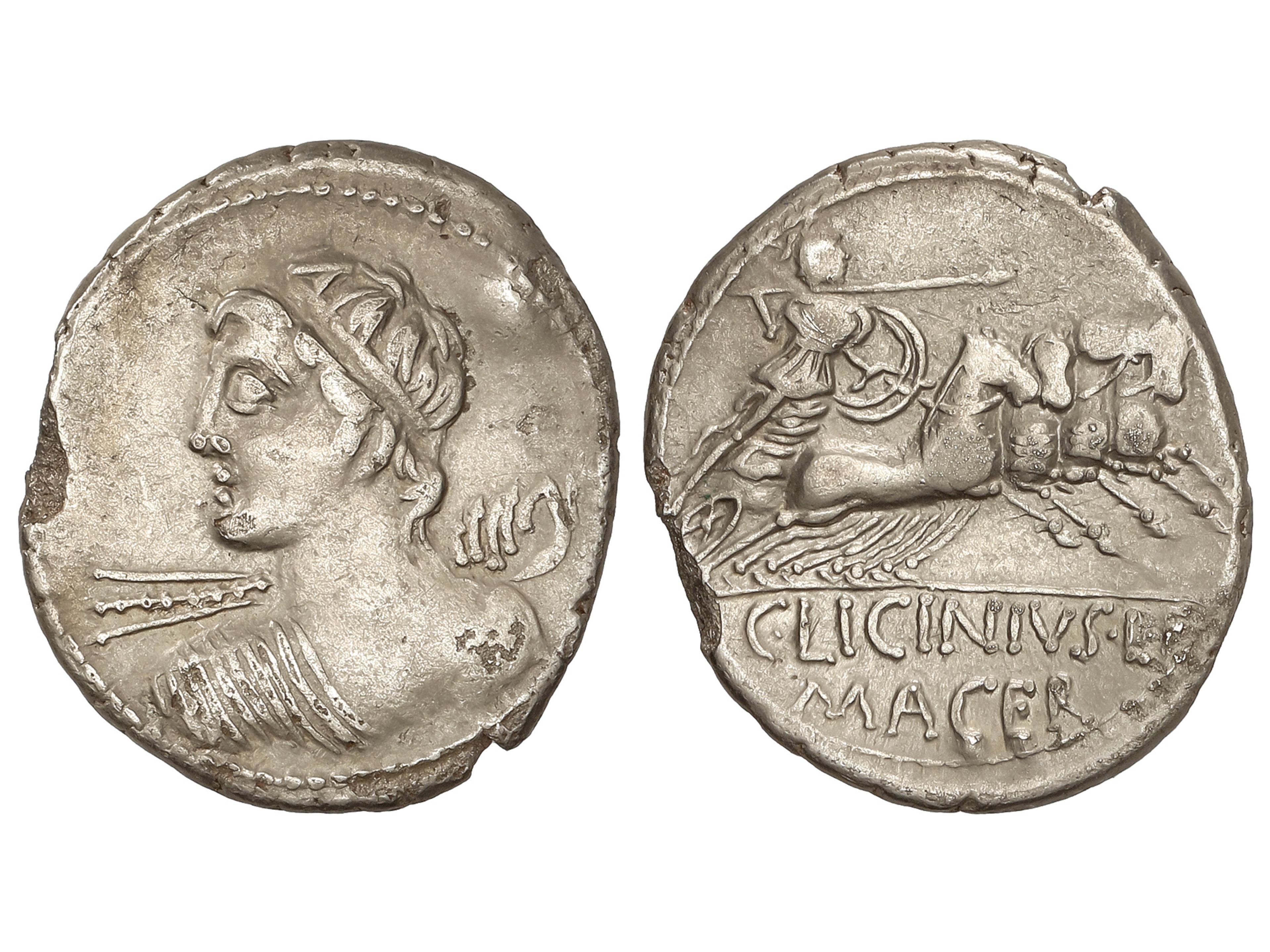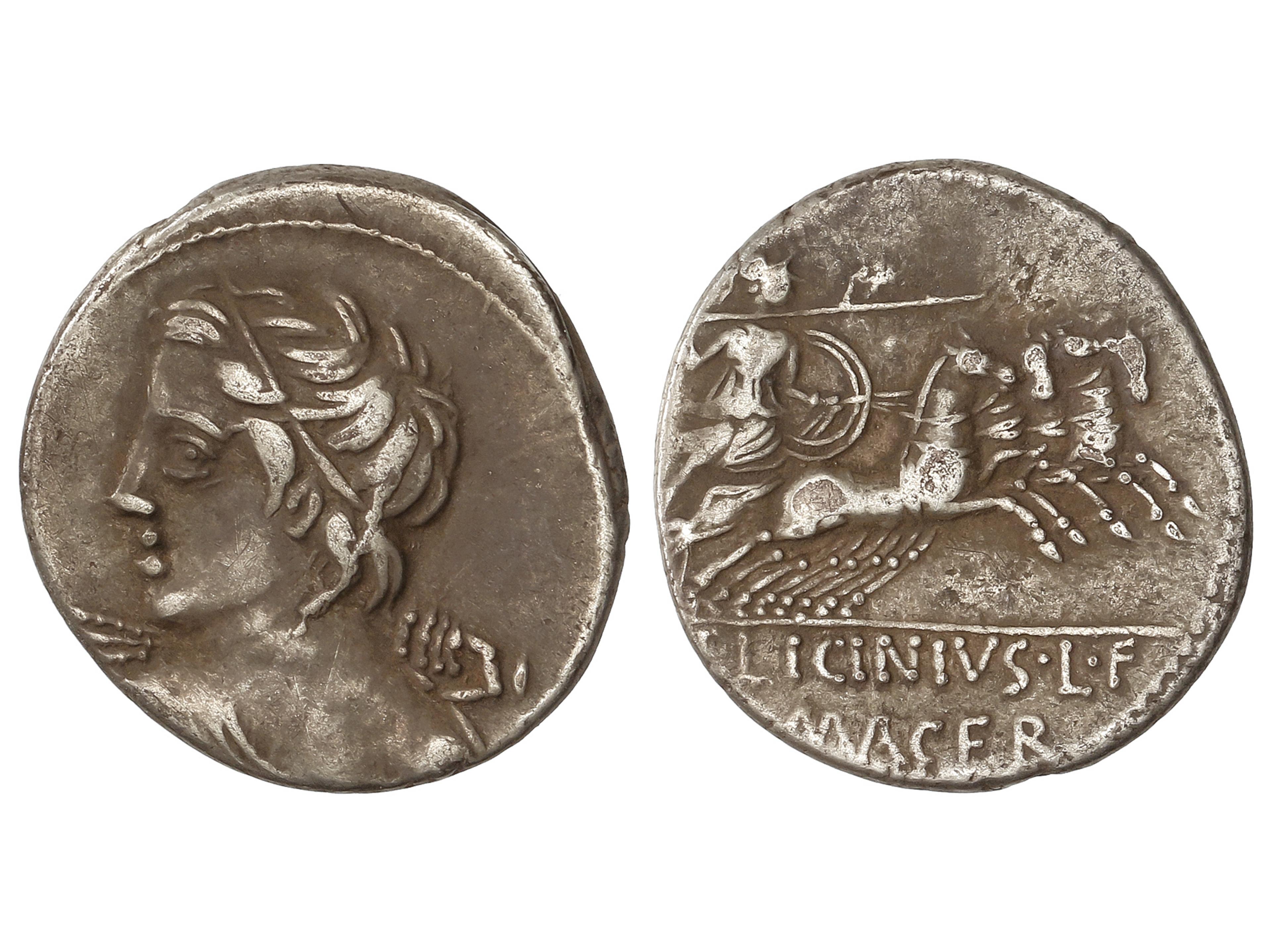 Denario. 84 a.C. LICINIA. C. Licinius L.f. Macer. Anv.: Cabeza diademada de Apolo Vejovis a izquierda. Rev.: Minerva en cuadriga a derecha. En exergo: C LICINIVS L.F / MACER. 3,98 grs. AR. Pátina. BMC-2467;
