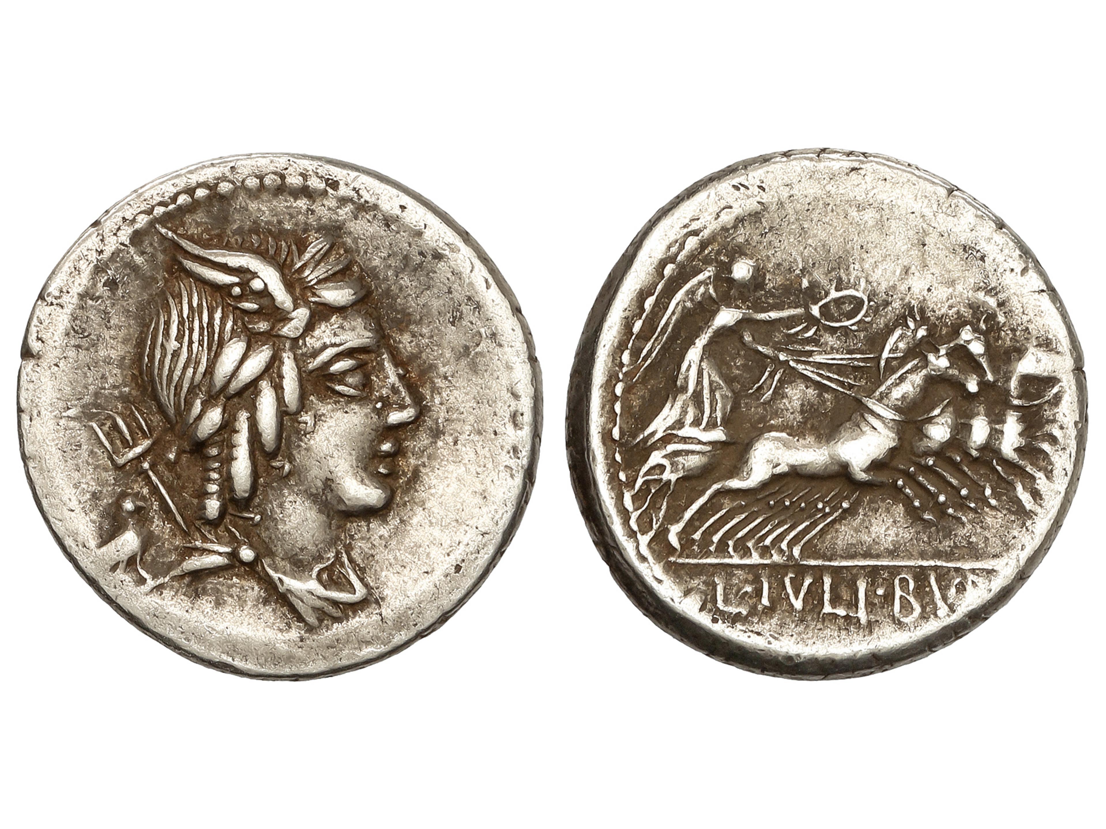 Denario. 85 a.C. JULIA. L. Julius Bursio. Anv.: Cabeza alada de Apolo Vejovis a derecha, detrás tridente y símbolo. Rev.: Victoria en cuadriga a derecha, en exergo L. IVLI. BVRSIO. 3,97 grs. AR. BMC-2485-07;