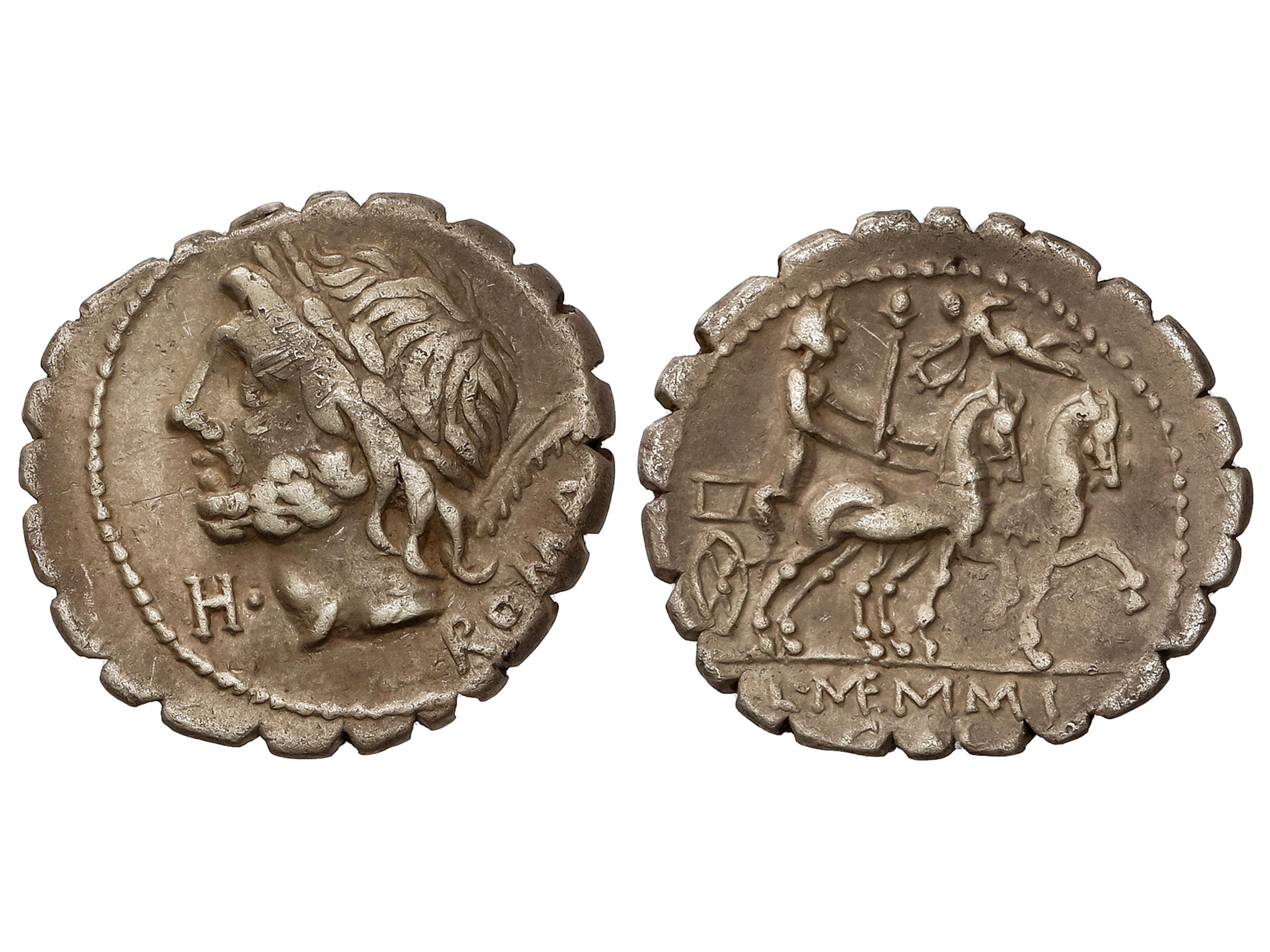 Denario. 87 a.C. MEMMIA. L y C. Memmius L. f. Galeria. Anv.: Cabeza laureada de Saturno a izquierda, delante letra H. Rev.: Venus con cetro en biga a derecha, coronada por Victoria volando encima de los