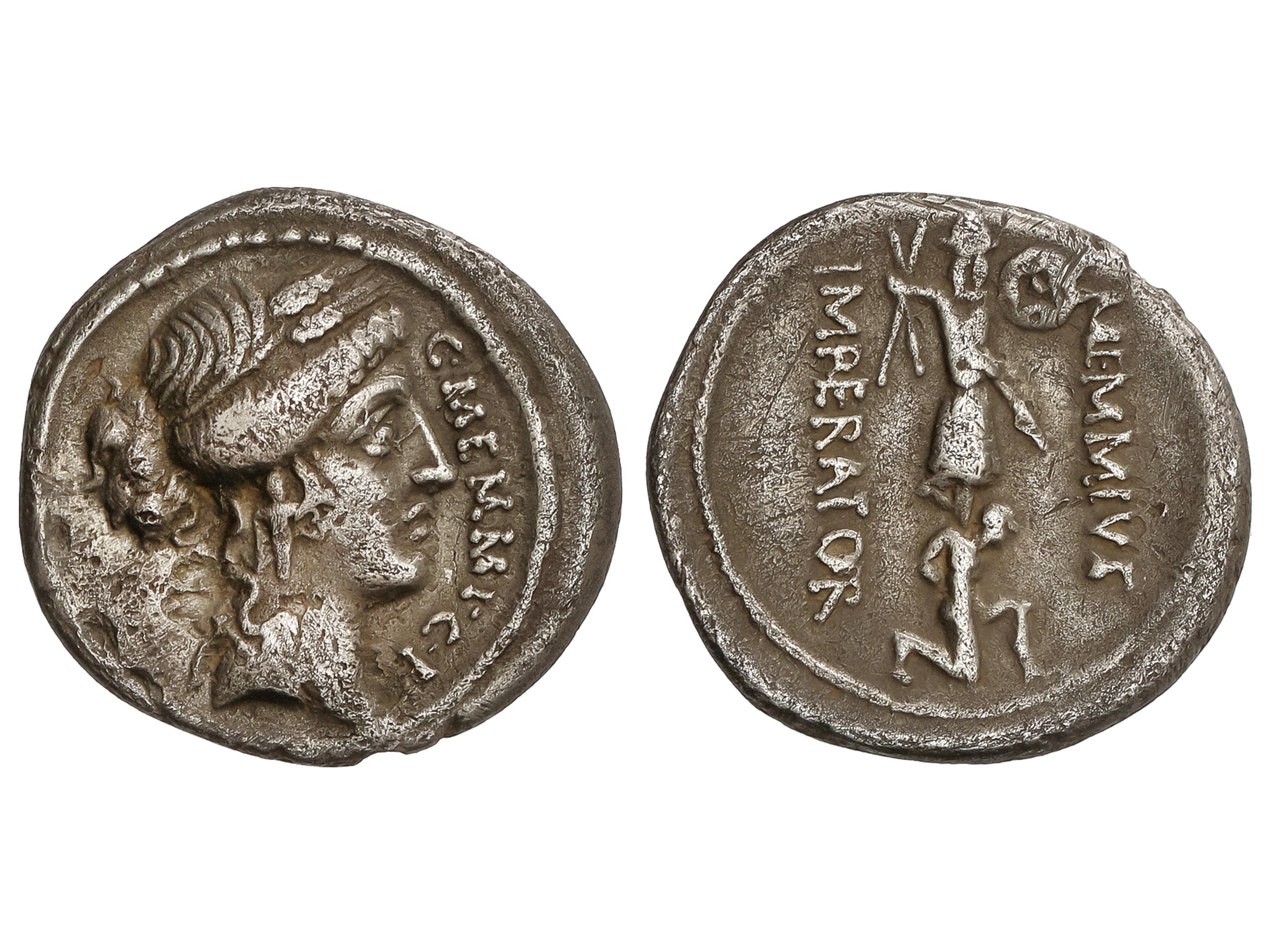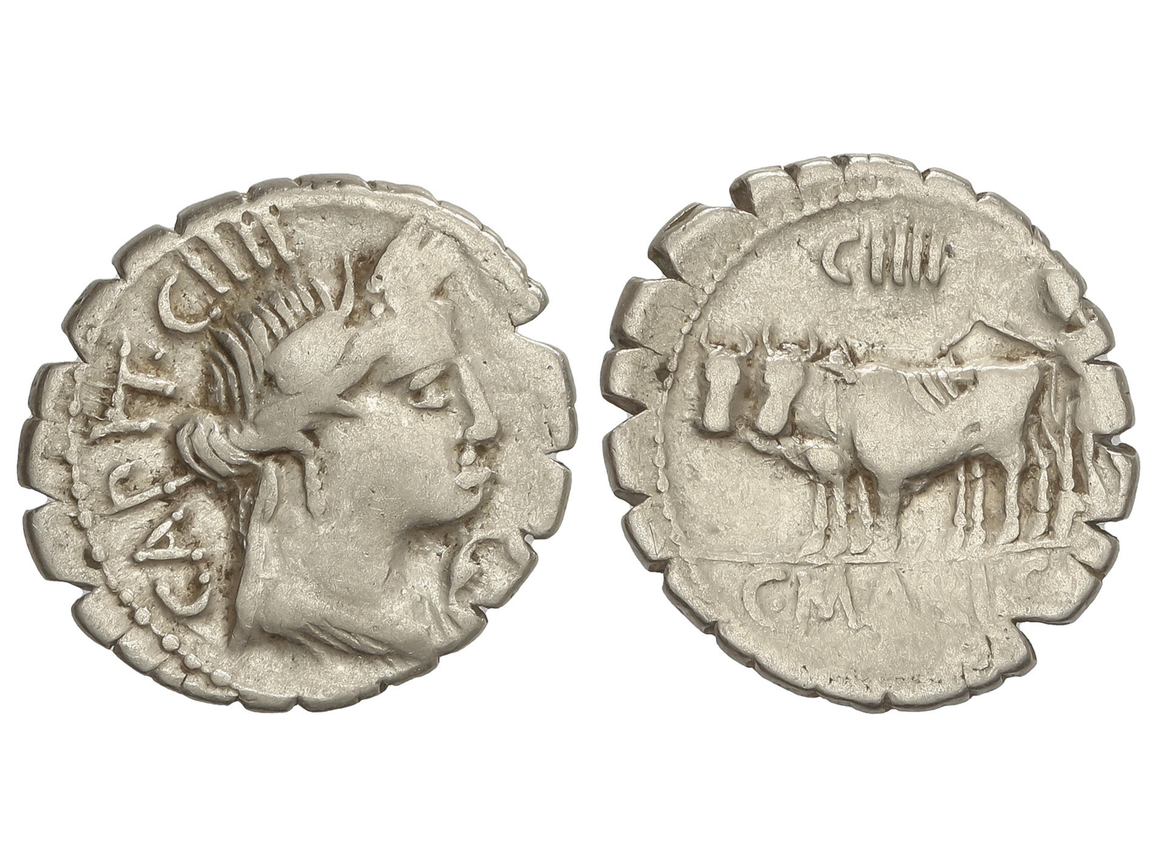 Denario. 81 a.C. MARIA. C. Marius C.f. Capito. Anv.: Cabeza laureada de Ceres a derecha, encima número CIIII, delante símbolo, detrás CAPIT. Rev.: Colono con bueyes a izquierda, encima número CIIII. En exergo: