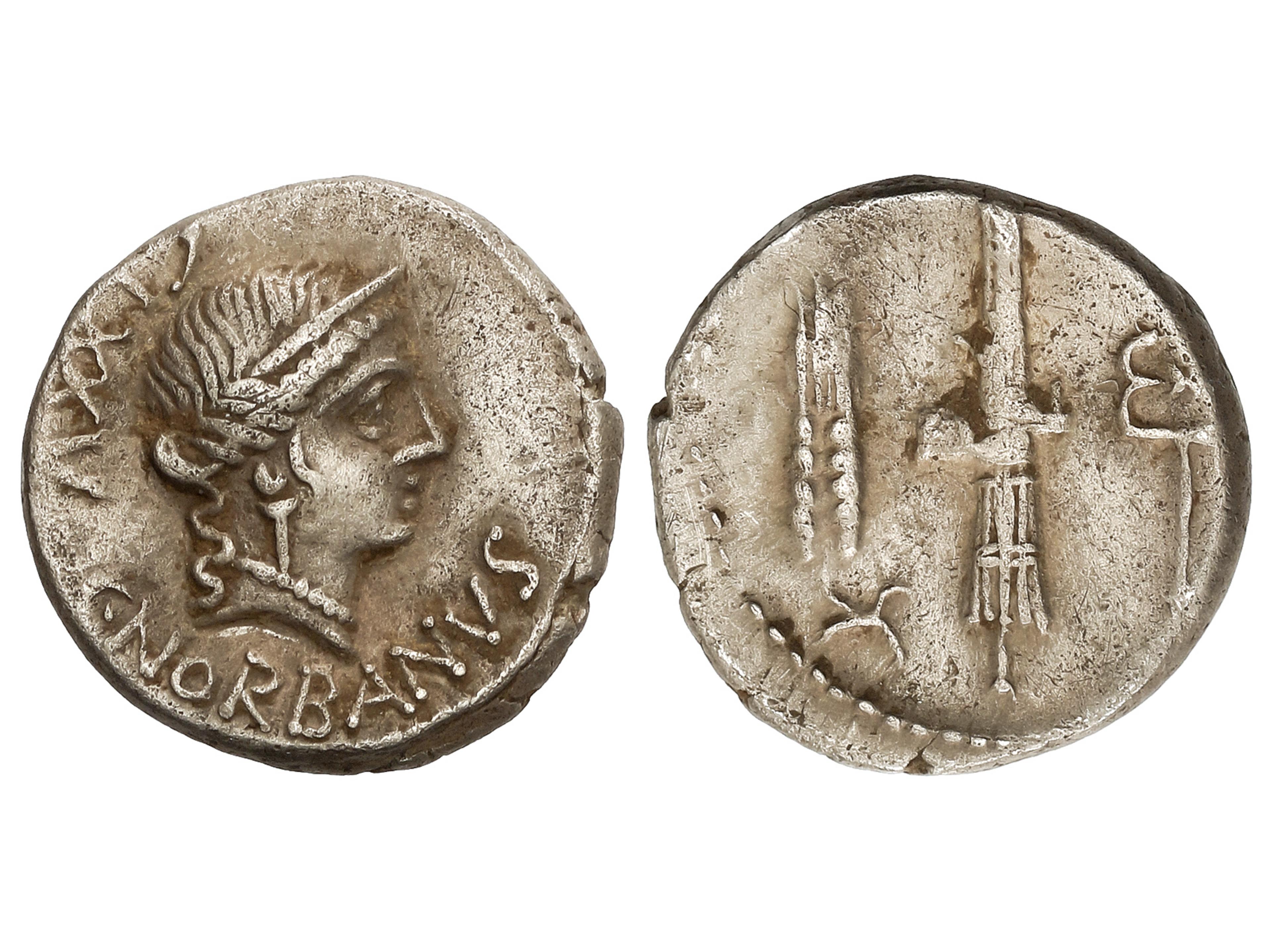 Denario. 83 a.C. NORBANA. C. Norbanus. Anv.: Cabeza diademada de Venus a derecha, detrás número, debajo C.NORBANVS. Rev.: Espiga, proa de nave, fasces con hacha y caduceo. 3,91 grs. AR. BMC-2770-26; Cal-1049;