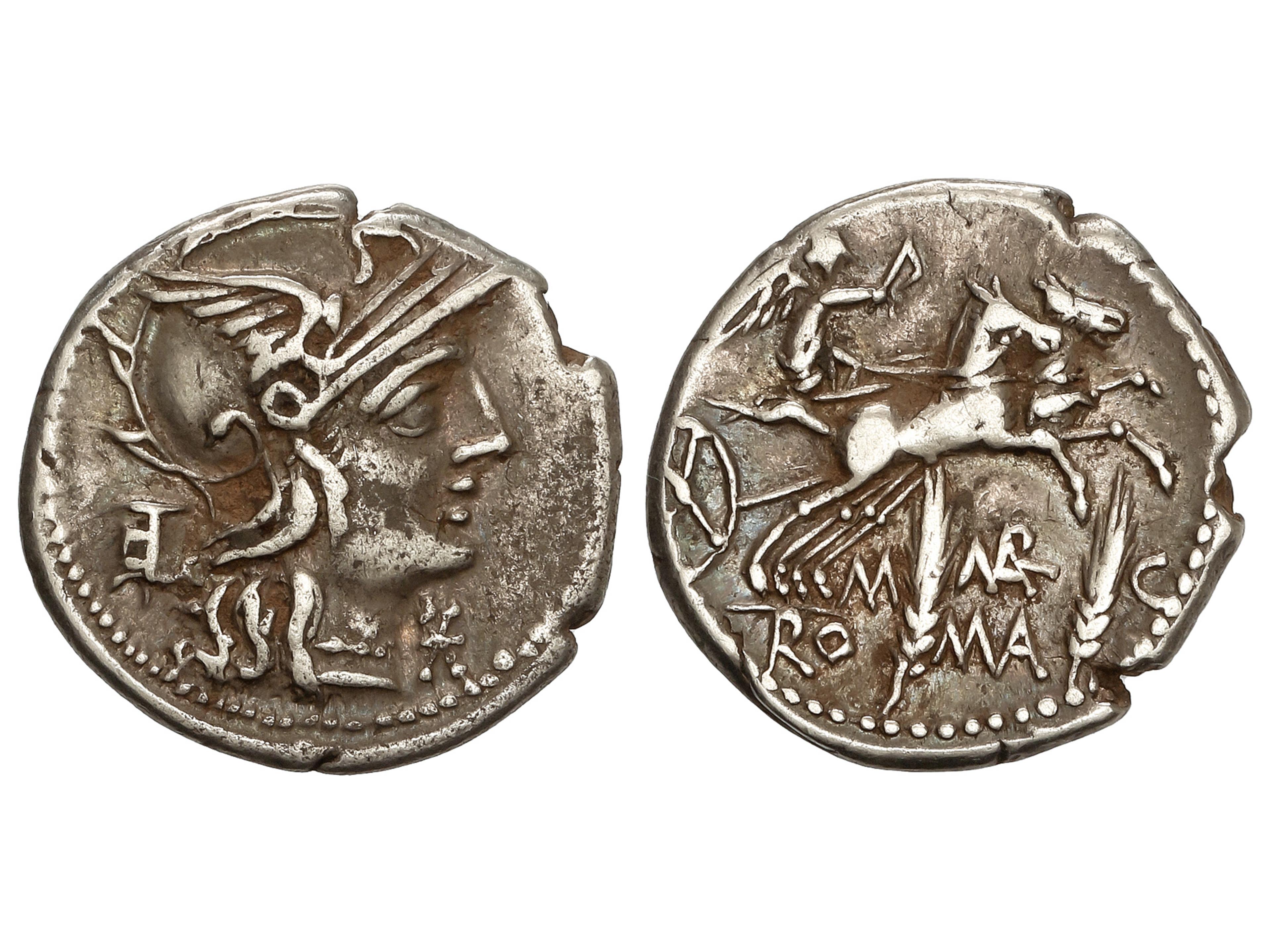 Denario. 148 a.C. MARCIA. M. Marcius Mn. F. Anv.: Cabeza de Roma a derecha entre modius y *. Rev.: Victoria en biga a derecha, debajo dos espigas, entre ellas M.-MAR-C. En exergo: ROMA. 3,75 grs. AR. BMC-1008;