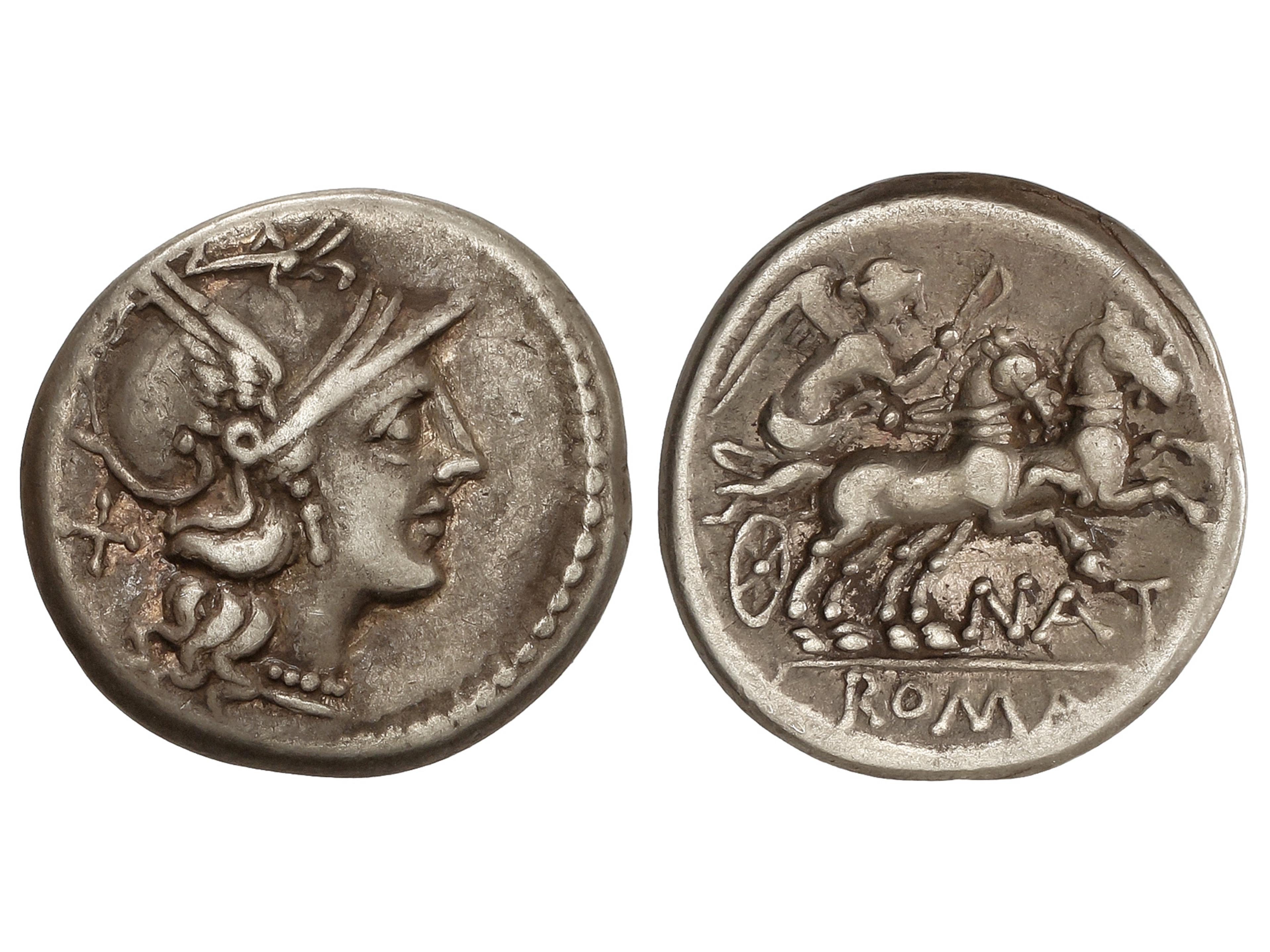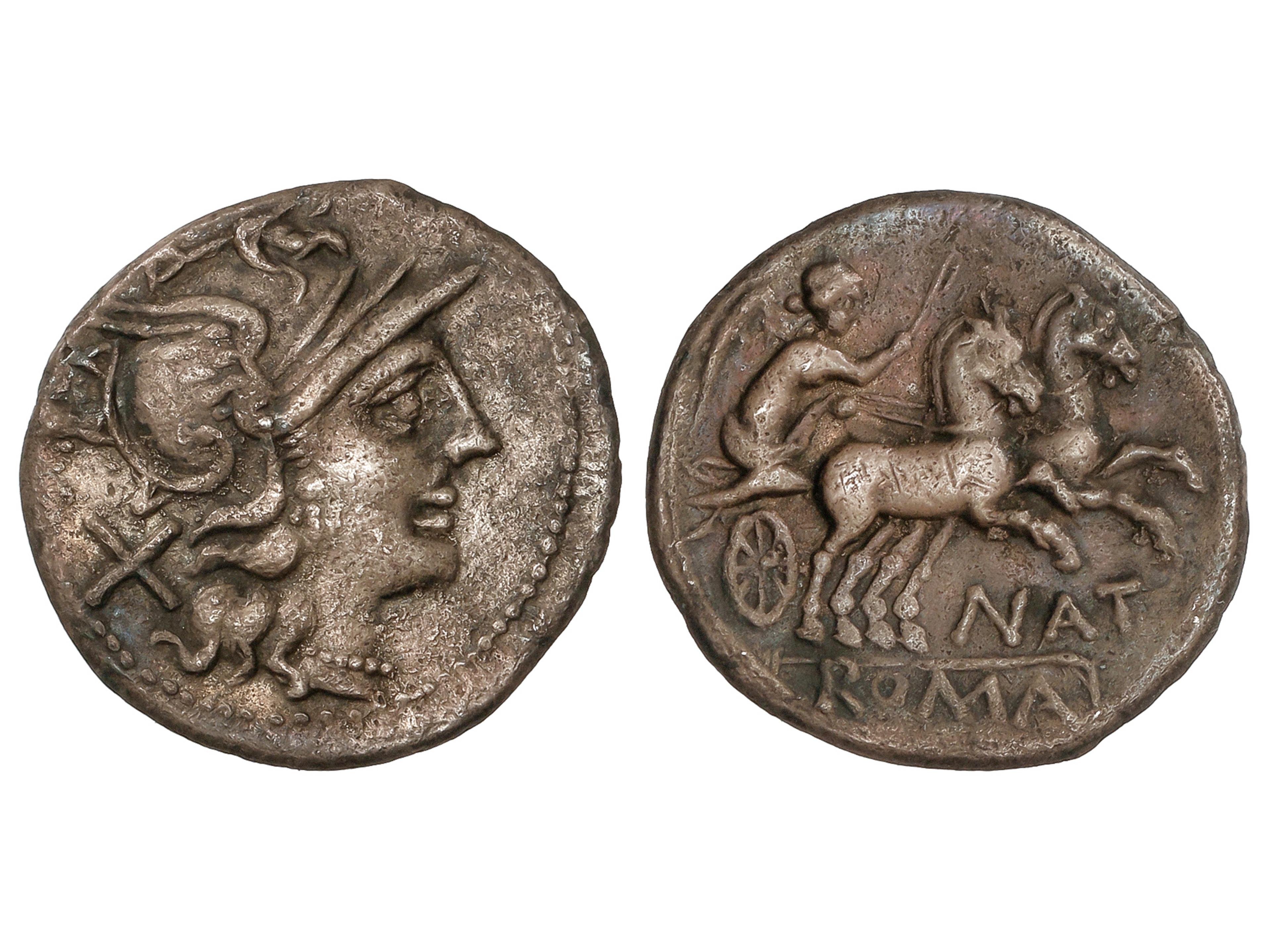 Denario. 155 a.C. PINARIA. Pinarius Natta. Anv.: Cabeza de Roma a derecha, detrás X. Rev.: Victoria en biga a derecha, debajo NAT. En exergo: ROMA en tabllilla. 3,96 grs. AR. BMC-756; Cal-1091; Craw-200/1;