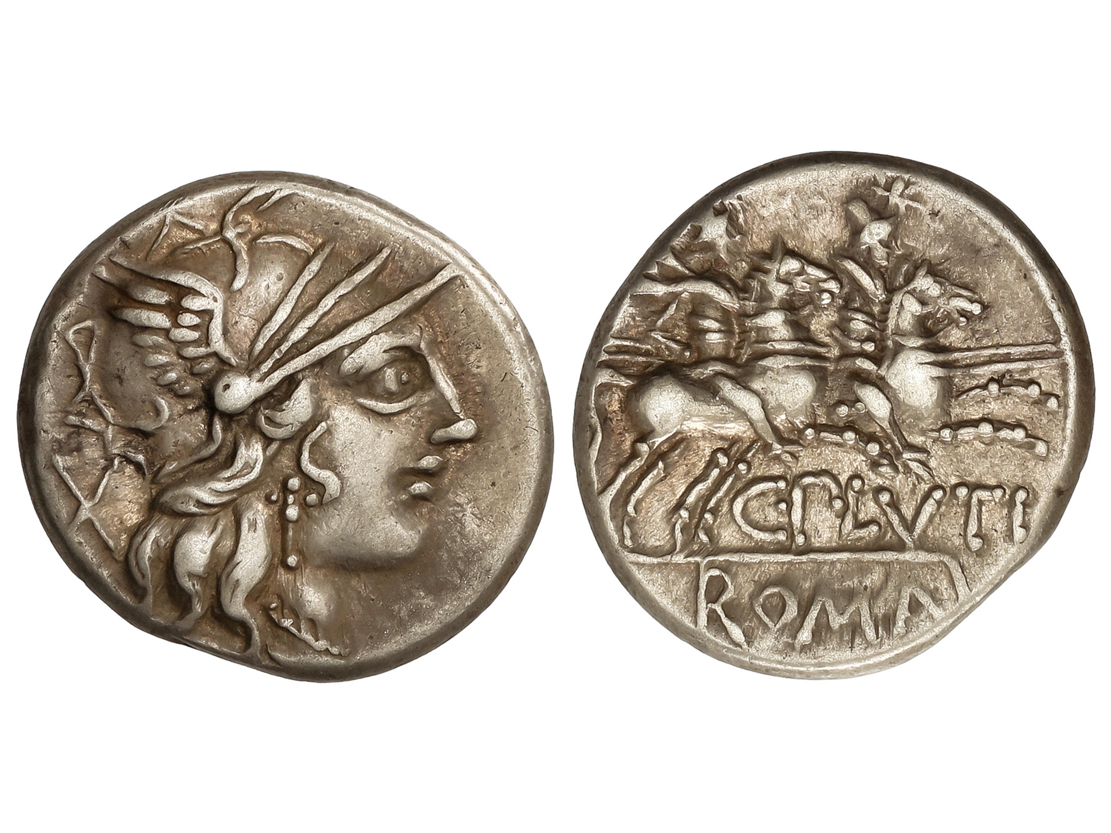Denario. 121 a.C. PLUTIA. C. Plutius. Anv.: Cabeza de Roma a derecha, detrás X. Rev.: Dioscuros a caballo a derecha., debajo C.PLVTI, en exergo ROMA en tablilla. 3,92 grs. AR. BMC-454; Cal-1136; Craw-278-1;