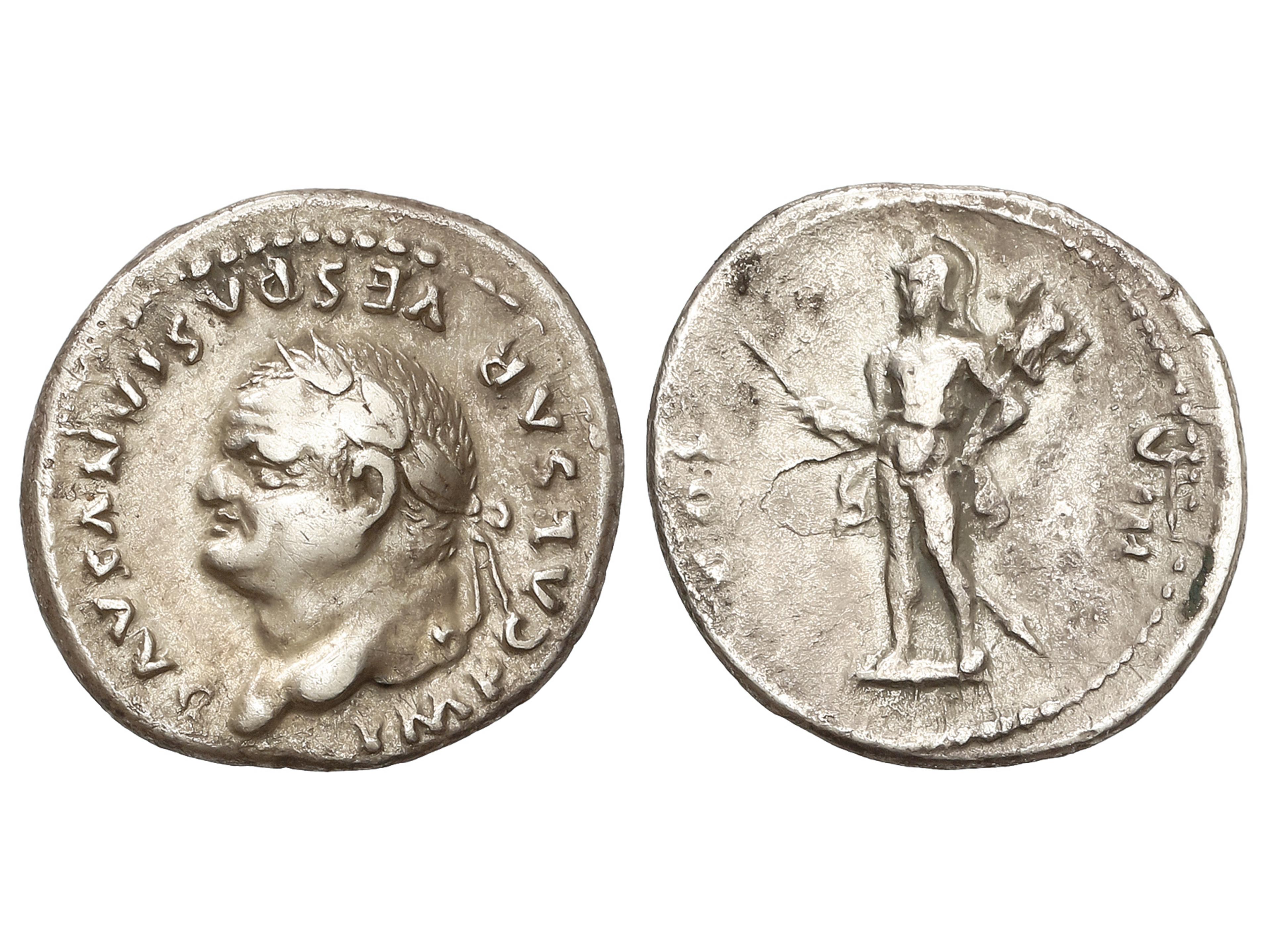 Denario. 77-78 d.C. VESPASIANO. Anv.: IMP CAESAR VESPASIANVS AVG. Busto laureado a izquierda. Rev.: COS VIII. Marte en marcha sosteniendo lanza y trofeo. 3,38 grs. AR. C-125; RIC-938. MBC. (Image1)