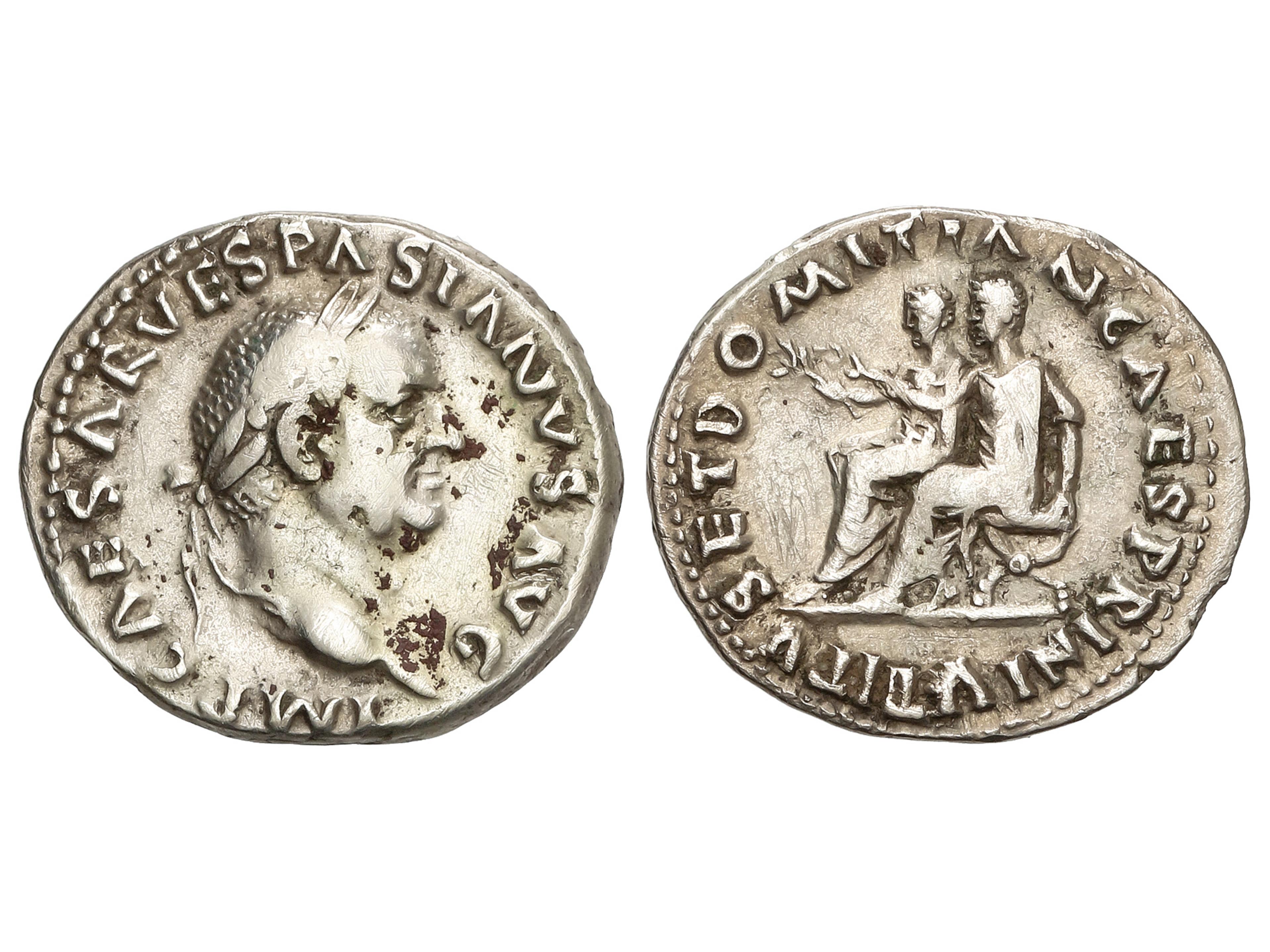 Denario. 69 d.C. VESPASIANO. Anv.: IMP. CAESAR VESPASIANVS AVG. Cabeza laureada a derecha. Rev.: TITVS ET DOMITIAN. CAES. PRIN. IV. Tito y Domiciano sentados en sillas curules a izquierda, con ramas. 3,14 grs. AR.
