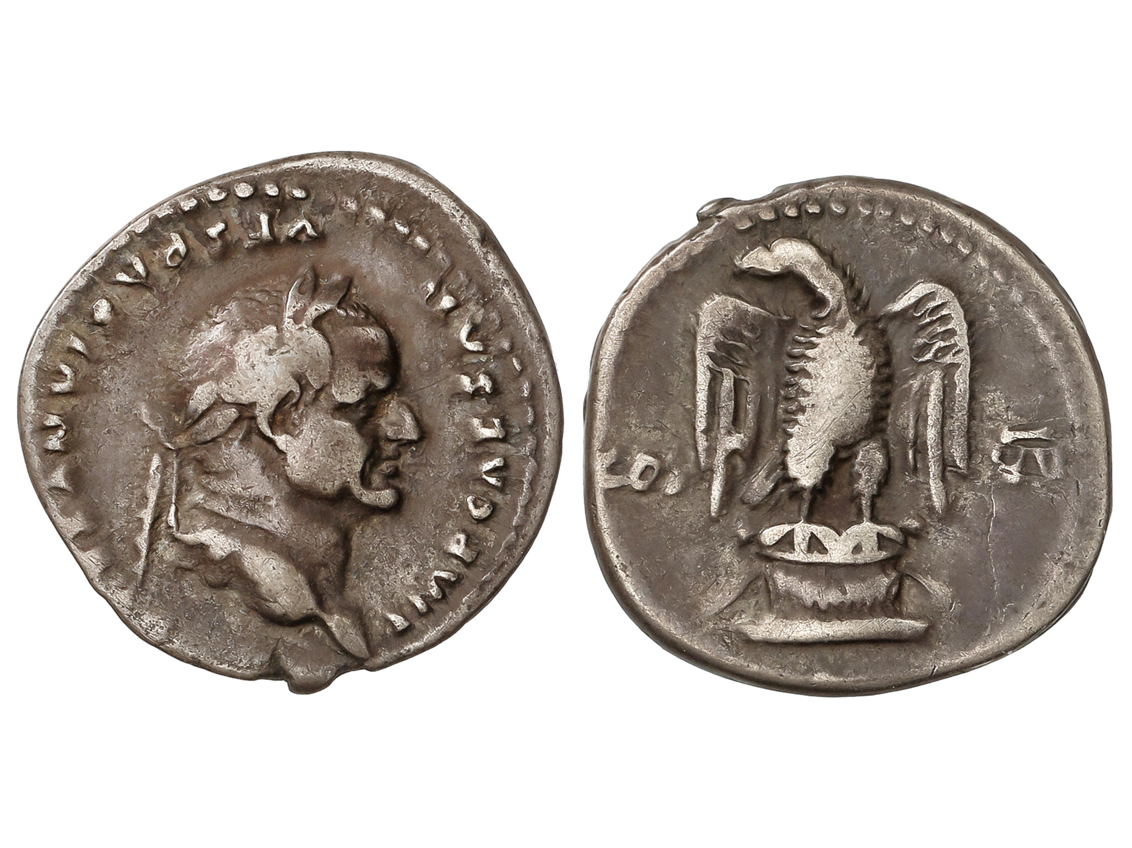 Denario. 69 d.C. VESPASIANO. Anv.: IMP. CAESAR VESPASIANVS AVG. Cabeza laureada a derecha. Rev.: COS VII. Águila mirando a izquierda sobre altar. 3,43 grs. AR. Pátina. C-121; RIC-99a. MBC. (Image1)