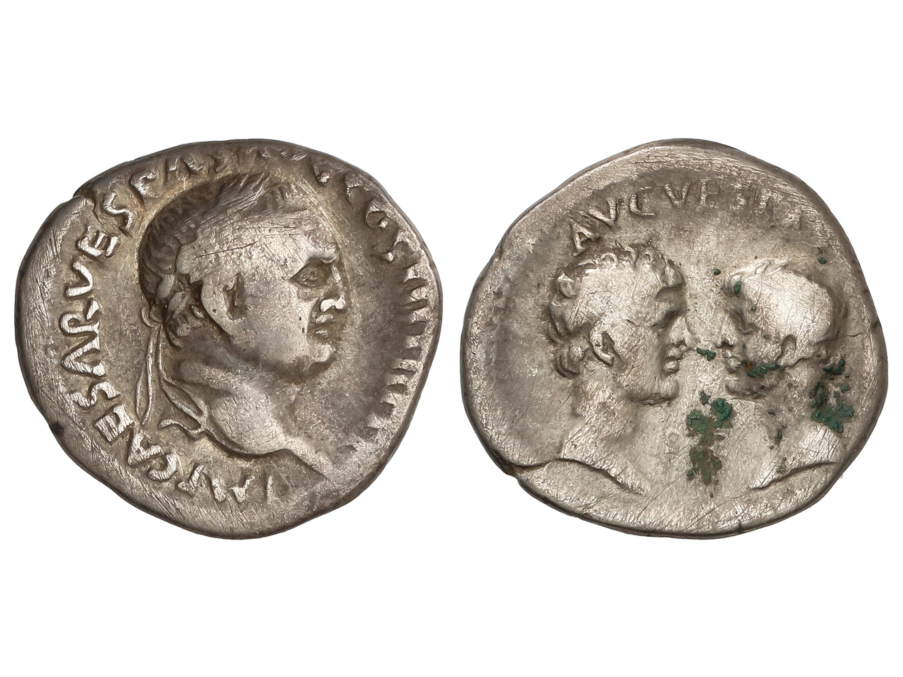 Denario. 69-79 d.C. VESPASIANO. Anv.: IMP. CAESAR VESPAS. AVG COS III TR. P P. P. Busto laureado a derecha. Rev.: Cabezas descubiertas de Tito y Domiciano, frente a frente. E(PH)E. (LIBERI IM)P AVG VESPAS. 3,11 grs.