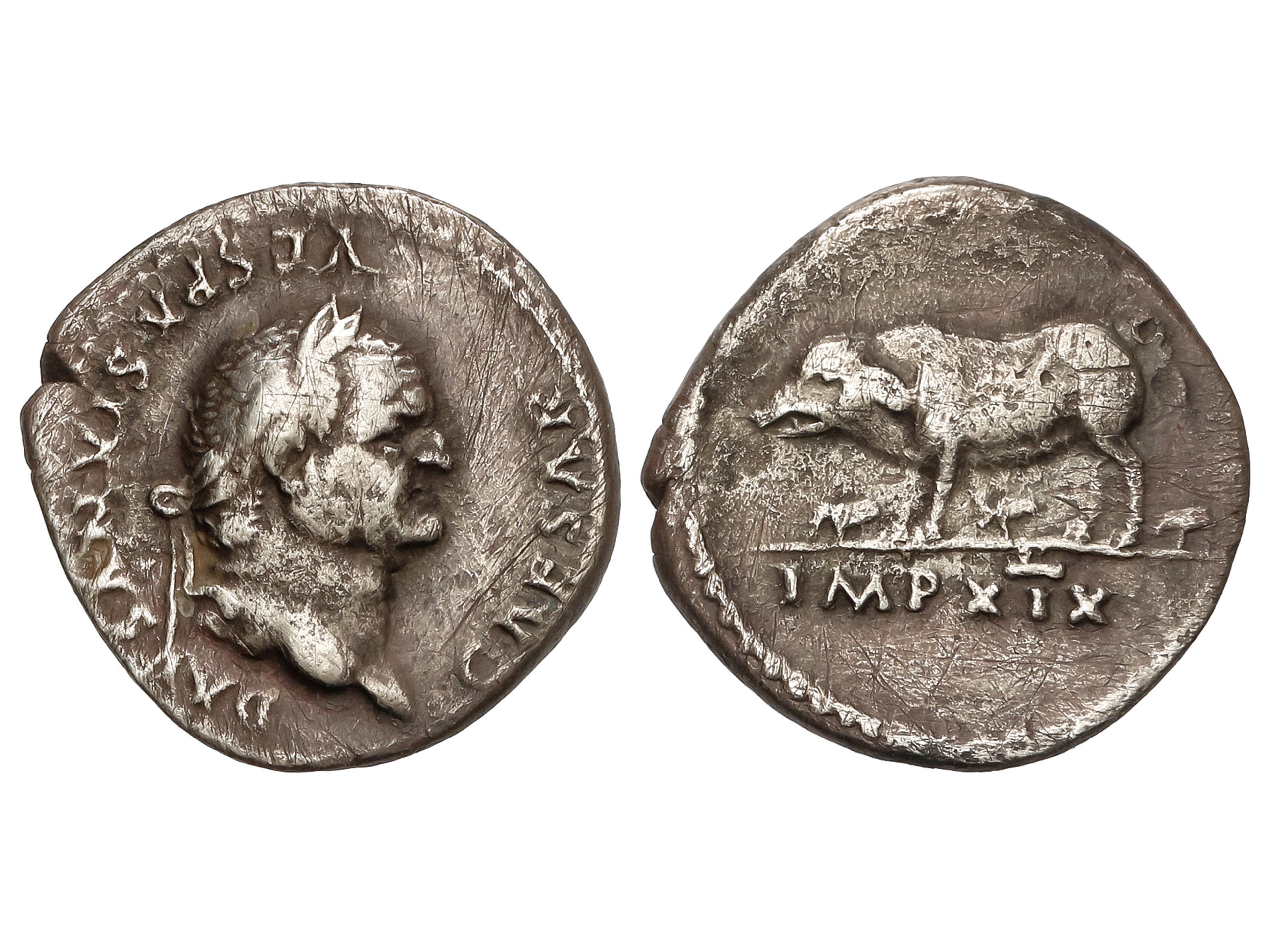 Denario. 77-78 d.C. VESPASIANO. Anv.: CAESAR VESPASIANVS AVG. Cabeza laureada a derecha. Rev.: IMP. XIX. Cerda a izquierda con tres crías. 3,10 grs. AR. (Pequeñas oxidaciones). Pátina. BMC 212; C- 213; RIC- 982.