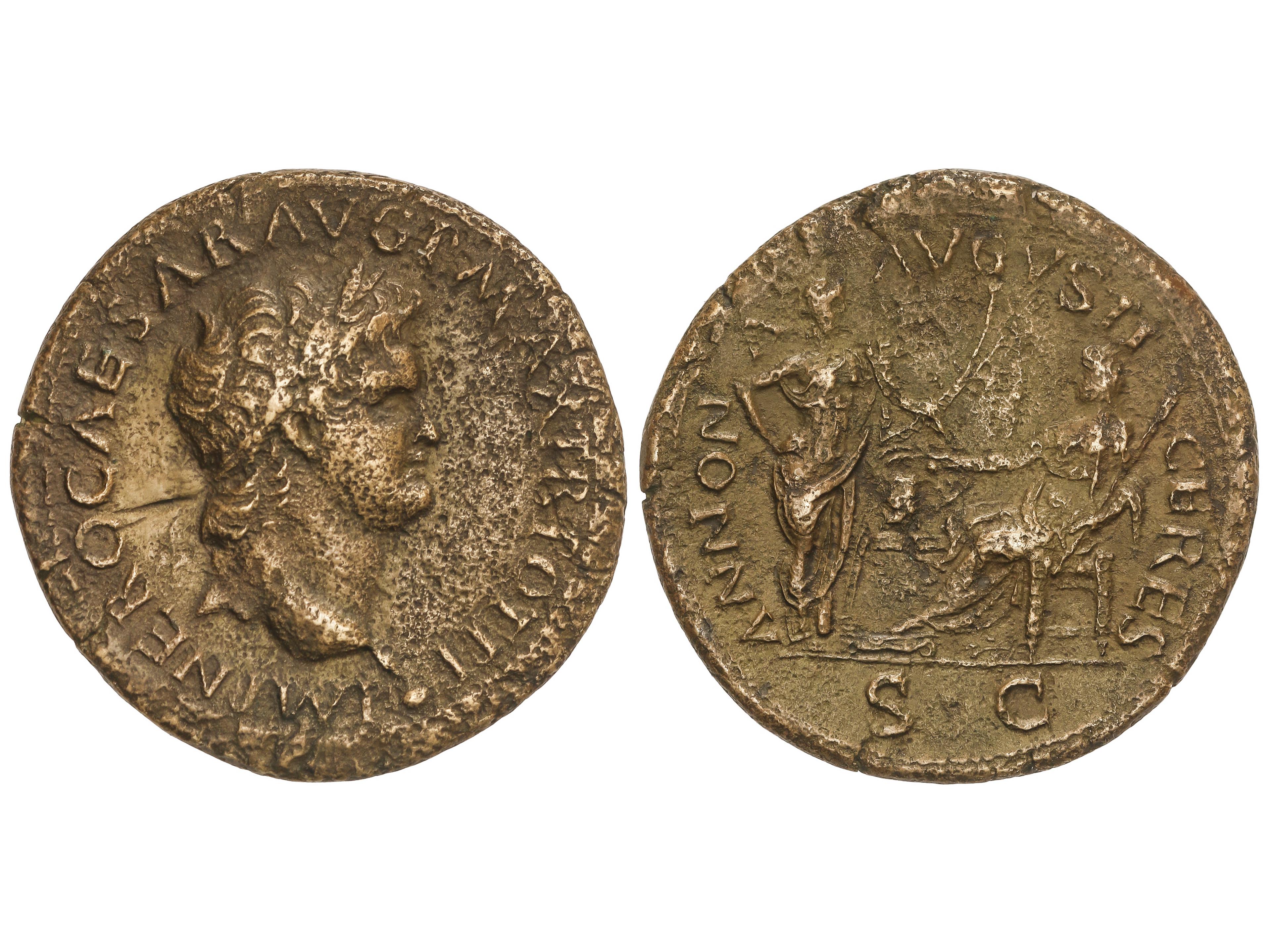 Sestercio. 62-68 d.C. NERÓN. Lugdunum. Anv.: IMP. NERO CAESAR AVG.P MAX. TR. POT.P P. Cabeza laureada a derecha. Rev.: ANNONA AVGVSTI CERES. Ceres sentada a izquierda con antorcha y espigas, frente a ella