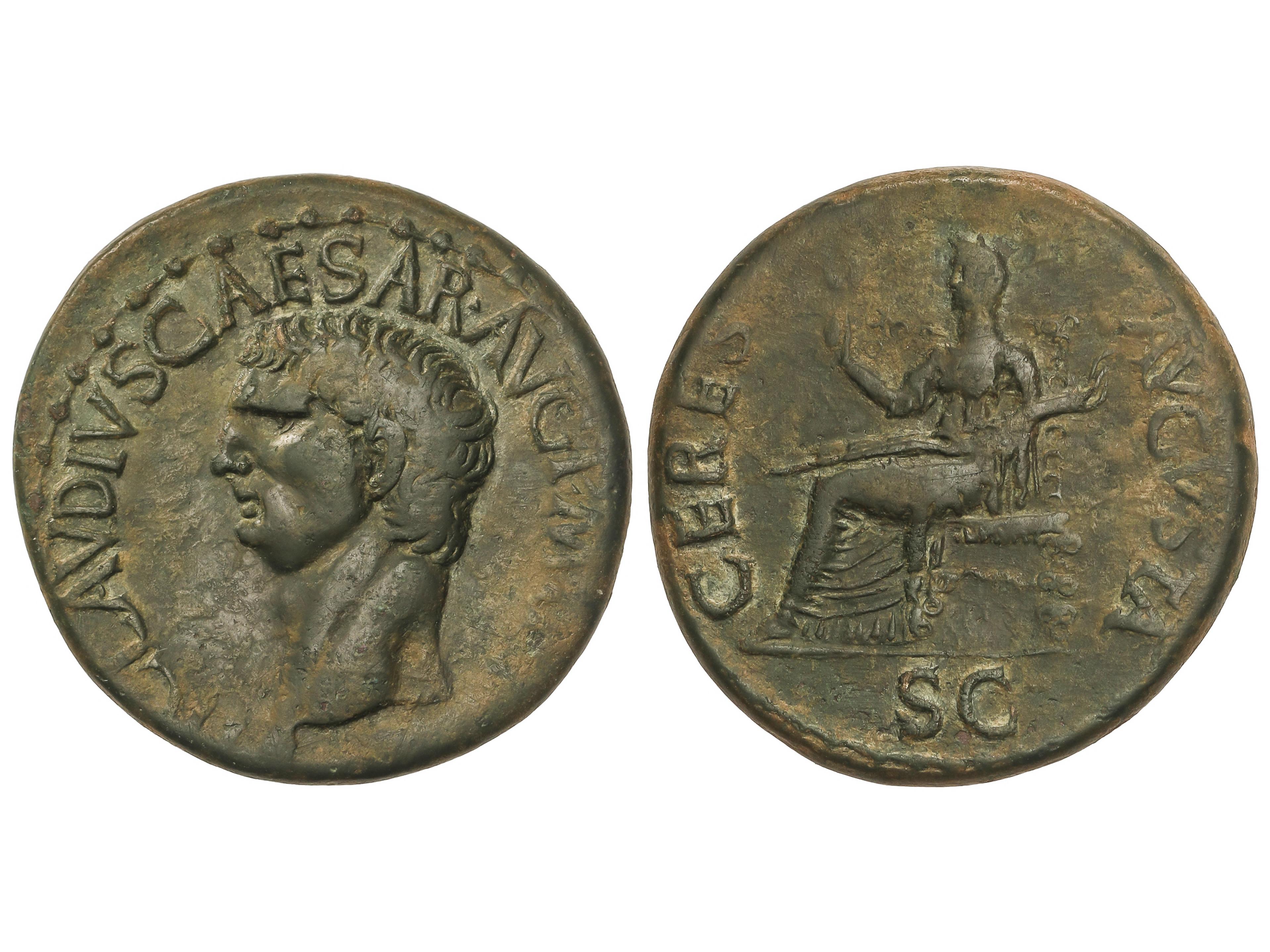 Dupondio. 41 d.C. CLAUDIO. Anv.: TI. CLAVDIVS CAESAR AVG. IMP. P. M. TR. P. Cabeza descubierta a izquierda. Rev.: CERES AVGVSTA S. C. Ceres sentada a izquierda. 15,38 grs. AE. Pátina verde. C-1; RIC-94. MBC. (Image1)